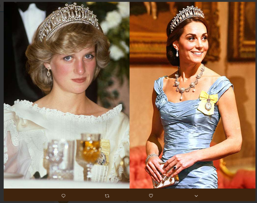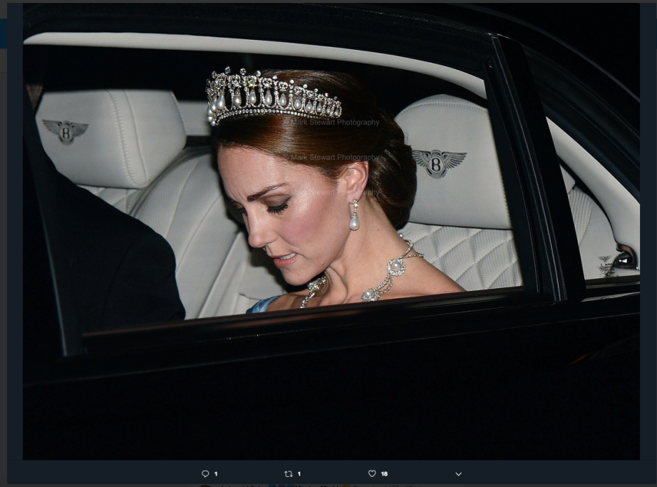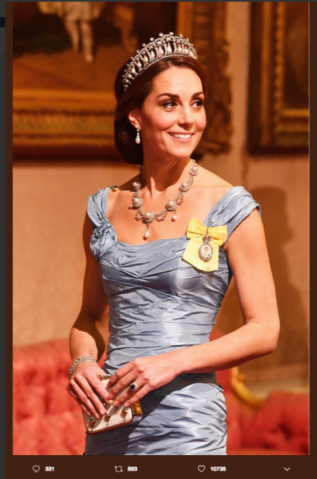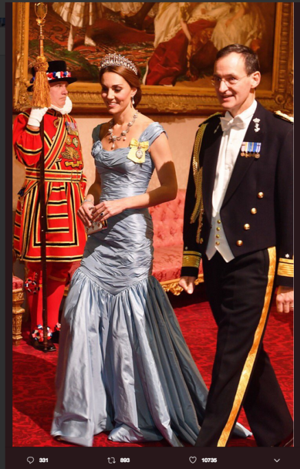 Kate è infatti apparsa a dir poco regale al ricevimento organizzato a Buckingham Palace per i Sovrani olandesi Willem-Alexander e Maxima d’Olanda. Indossava infatti un abito lungo Alexander McQueen, con la spilla dell’Ordine della Regina Elisabetta. L’acconciatura era impreziosita dalla tiara Cambridge, che la Sovrana aveva regalato a Lady Diana per il matrimonio con il Principe Carlo. A completare tanta maestosità, la collana nuziale della Principessa Alexandra. Era stata donata da Albert Edward, allora Principe di Galles e figlio della Regina Victoria, alla moglie Alexandra di Danimarca nel giorno del loro matrimonio, nel 1863. La collana è tra i gioielli preferiti della Regina Elisabetta.