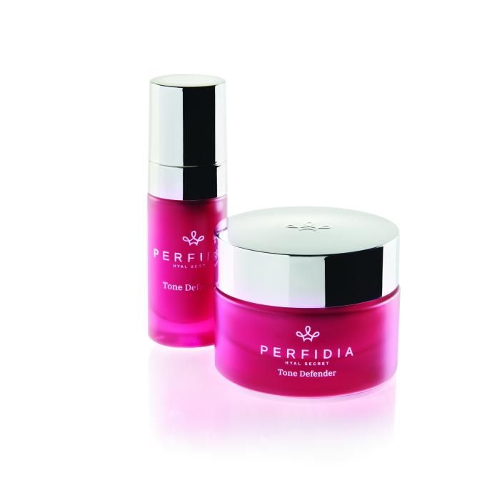 Per rivitalizzare il tono della pelle, invece, Perfidia Hyal Secret propone Tone Defender, anch’esso composto da due prodotti: la crema viso dalla texture morbida e setosa, con la sua preziosa azione ridensificante e illuminante, regala comfort e morbidezza alla pelle, conferendole un aspetto sano e radioso. La crema contorno occhi, con la sua composizione setosa, riduce le rughe, sottili e profonde, e lo sguardo scopre una nuova giovinezza.