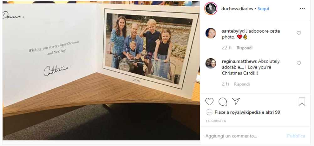 La cartolina 2019 è davvero disinvolta e allegra: Kate, il Principe William, Baby George, Baby Charlotte e Baby Louis sono riuniti intorno a un sidecar. Sorridenti e rilassati, comunicano davvero serenità e buonumore.