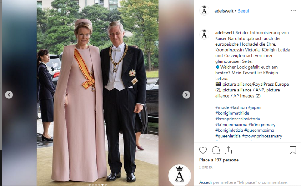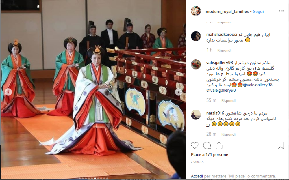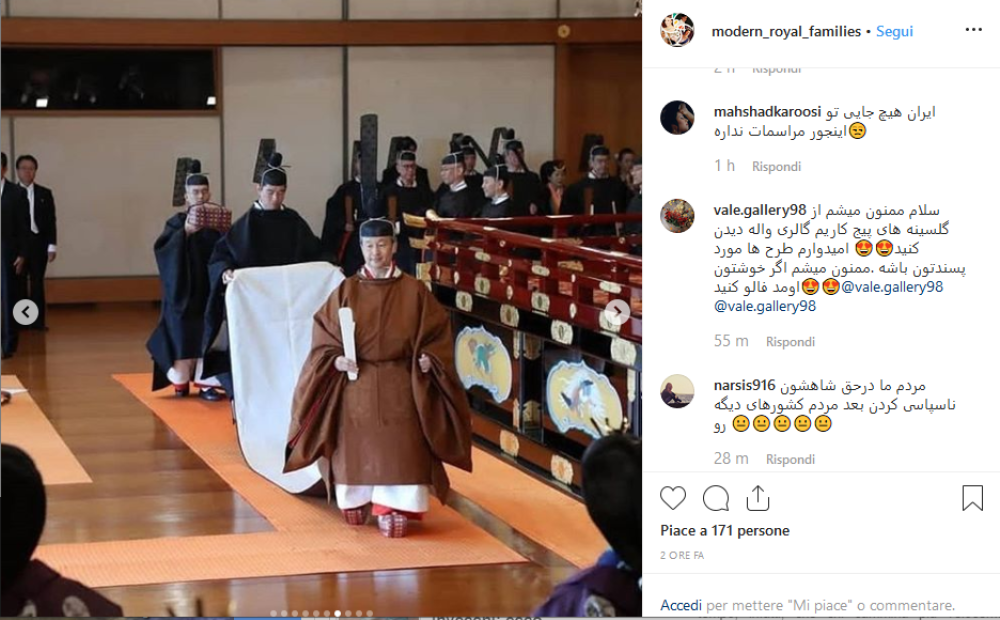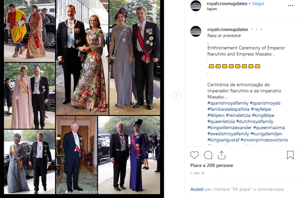 L’Imperatore Naruhito è stato solennemente incoronato nel palazzo imperiale di Tokyo, con una cerimonia di antichissima tradizione, davvero suggestiva. All’evento hanno partecipato duemila ospiti e tanti erano i reali invitati, dal Principe Carlo d’Inghilterra al Principe Alberto di Monaco, dai sovrani di Danimarca a quelli del Belgio.