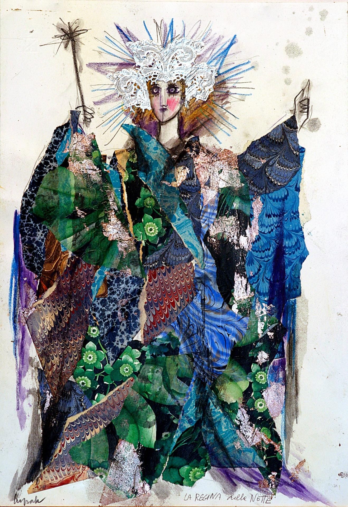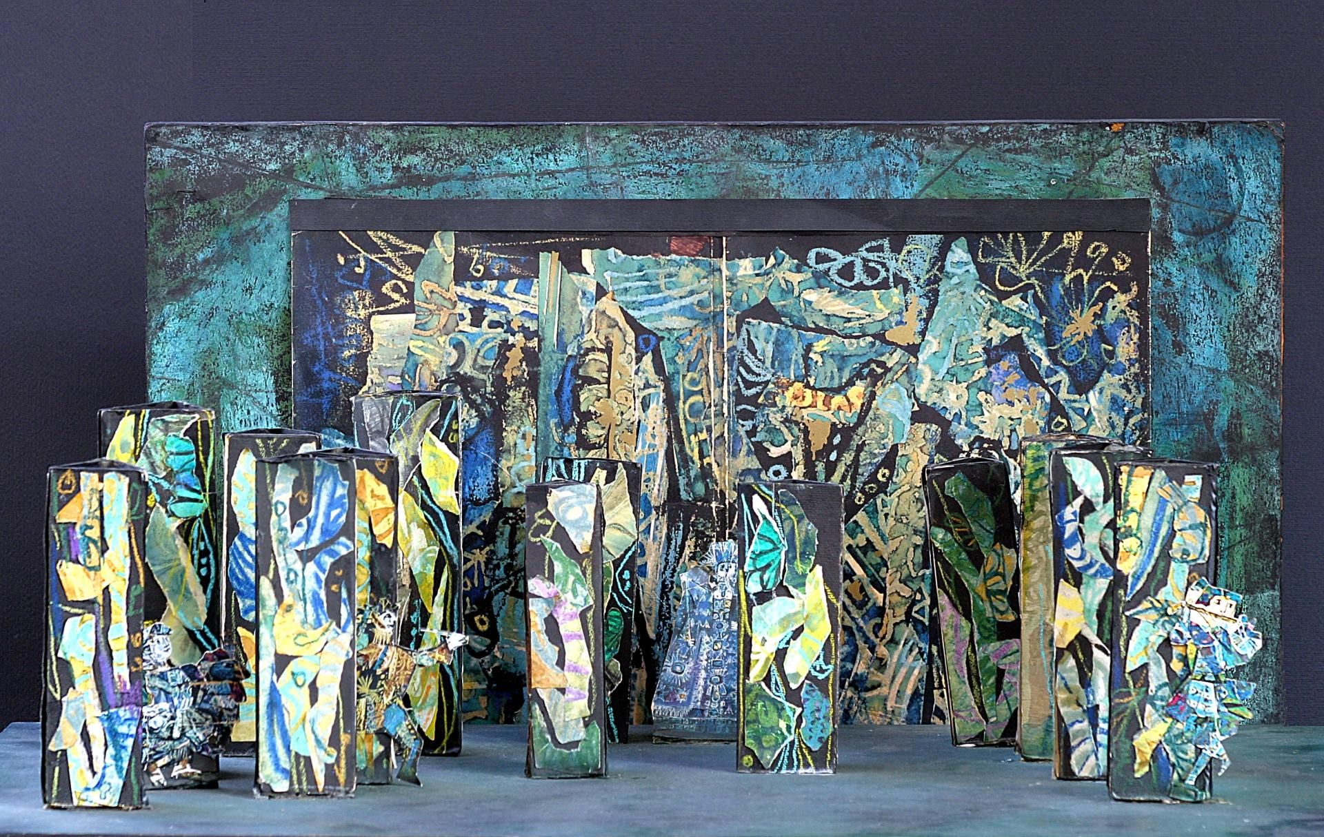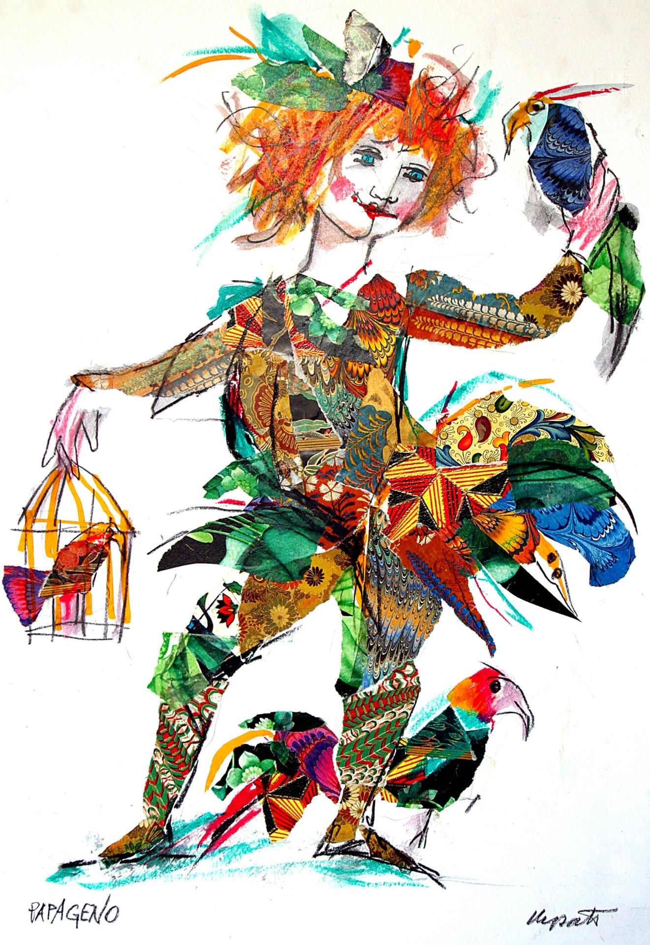 Le due grandi statue, alte quasi 3 metri, in legno sagomato e dipinto, raffiguranti Papageno e la Regina della Notte, realizzate per lo spettacolo “ Il flauto magico”.