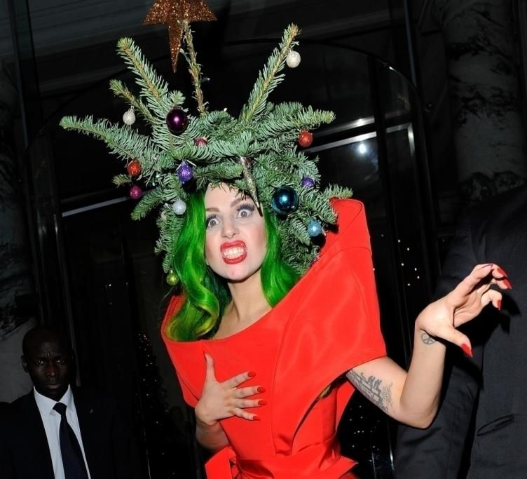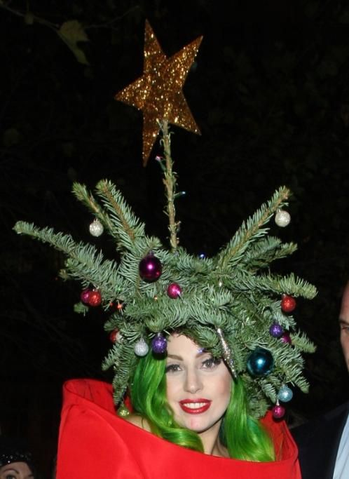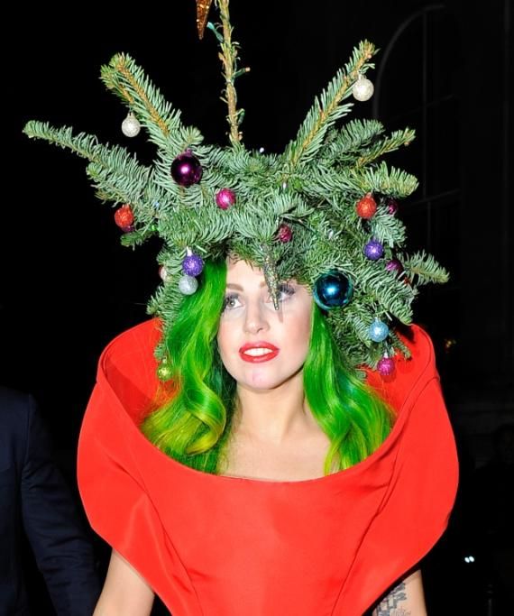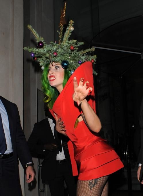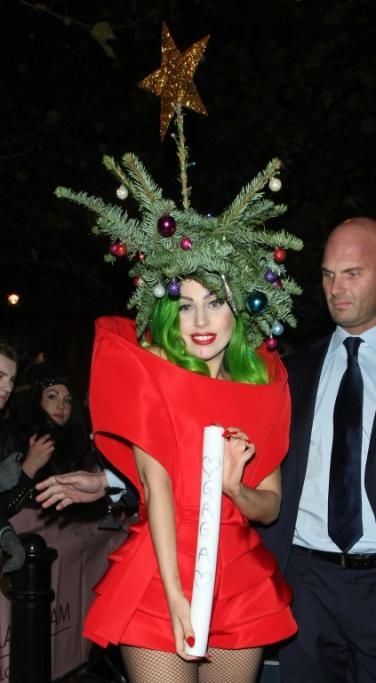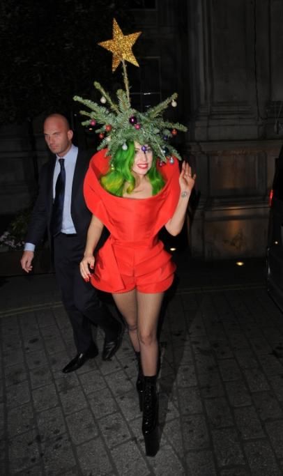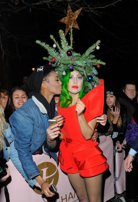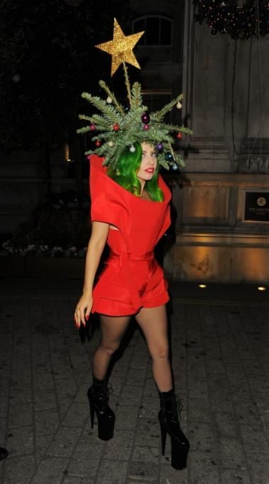 La cantante arriva addobbata da albero di Natale al Langham Hotel di Londra, dopo aver partecipato al Jingle Bell Ball (foto Splash News)