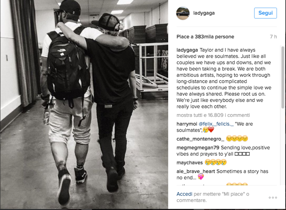 L’annuncio ufficiale è arrivato con un post pubblicato sull’account Instagram dalla cantante: «Taylor ed io abbiamo sempre creduto di essere anime gemelle. Come tutte le coppie abbiamo avuti alti e bassi. E ora abbiamo deciso di prenderci una pausa. Siamo due artisti ambiziosi, speriamo di far funzionare il rapporto, anche con un rapporto a distanza e con un’agenda piena di impegni, e continuare con il semplice amore che abbiamo sempre condiviso. Per favore, tifate per noi. Siamo come tutti gli altri e ci amiamo davvero moltissimo».