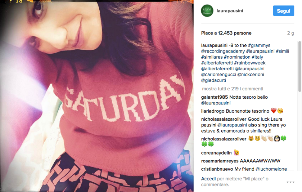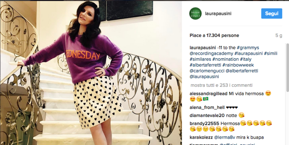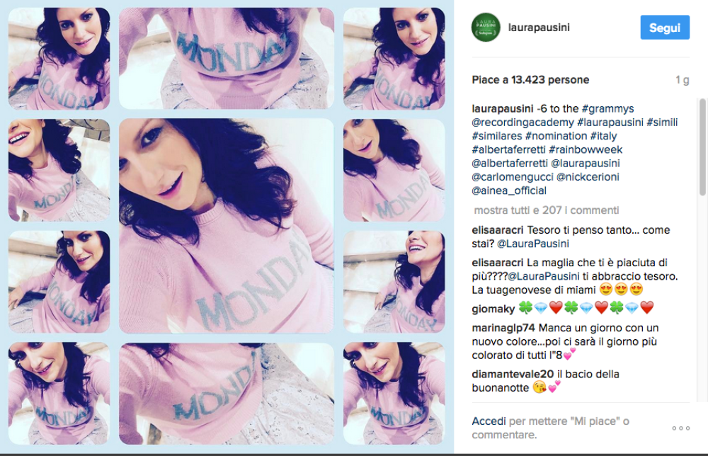 Laura Pausini è candidata ai Grammy Awards (quest’anno in programma il 12 febbraio) nella categoria Best Latin Pop Album con “Similares”, versione spagnola di “Simili”. La cantante ha trovato un modo davvero spiritoso per ingannare l’attesa del fatidico giorno: pubblica infatti sul suo account Instagram una serie di selfie con dei maglioni che scandiscono il passare dei giorni.