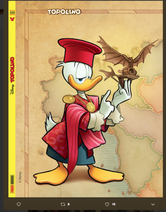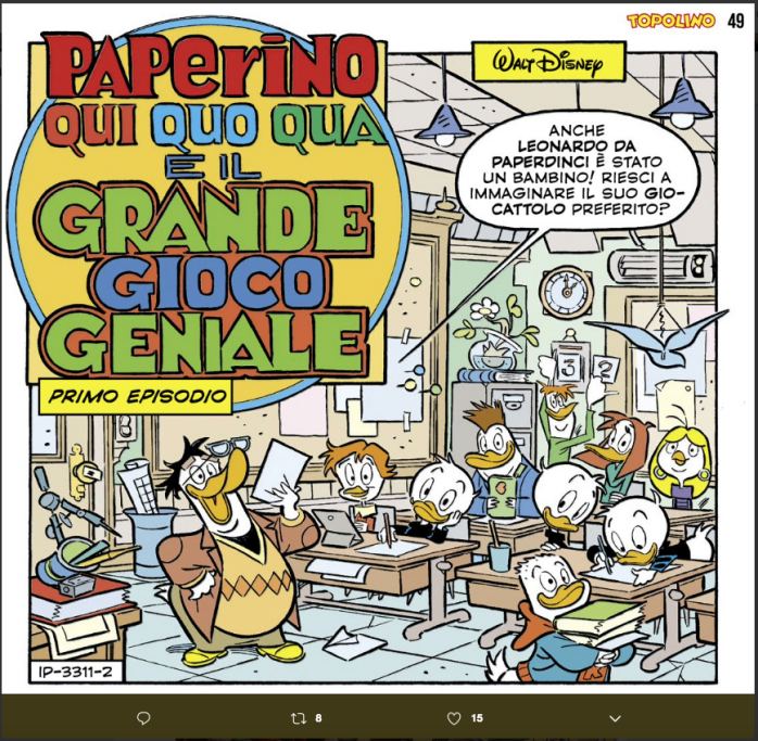 Anche il settimanale Topolino festeggia i 500 anni dalla morte di Leonardo da Vinci. Il magazine a fumetti pubblica infatti una storia in 5 puntate intitolata “Paperino, Qui, Quo, Qua e il grande gioco geniale” (storia di Bruno Enna, disegni di Andrea Freccero, Nicola Tosolini, Lorenzo Pastrovicchio, Giampaolo Soldati, Alessandro Perina)