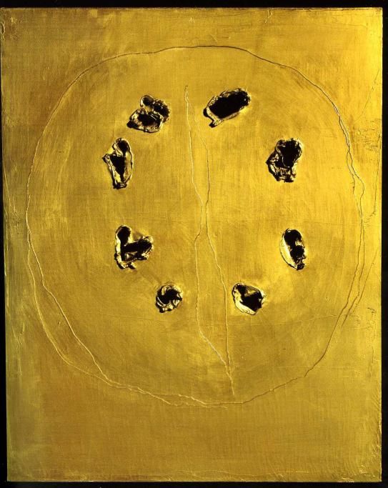 Con Duccio di Boninsegna si assiste a una ulteriore evoluzione in termini di complessità ed eleganza di queste abilità di lavorazione dell’oro. La sua Madonna col Bambino e sei angeli (1304-1310) dialoga con il Concetto spaziale su fondo oro di Lucio Fontana.