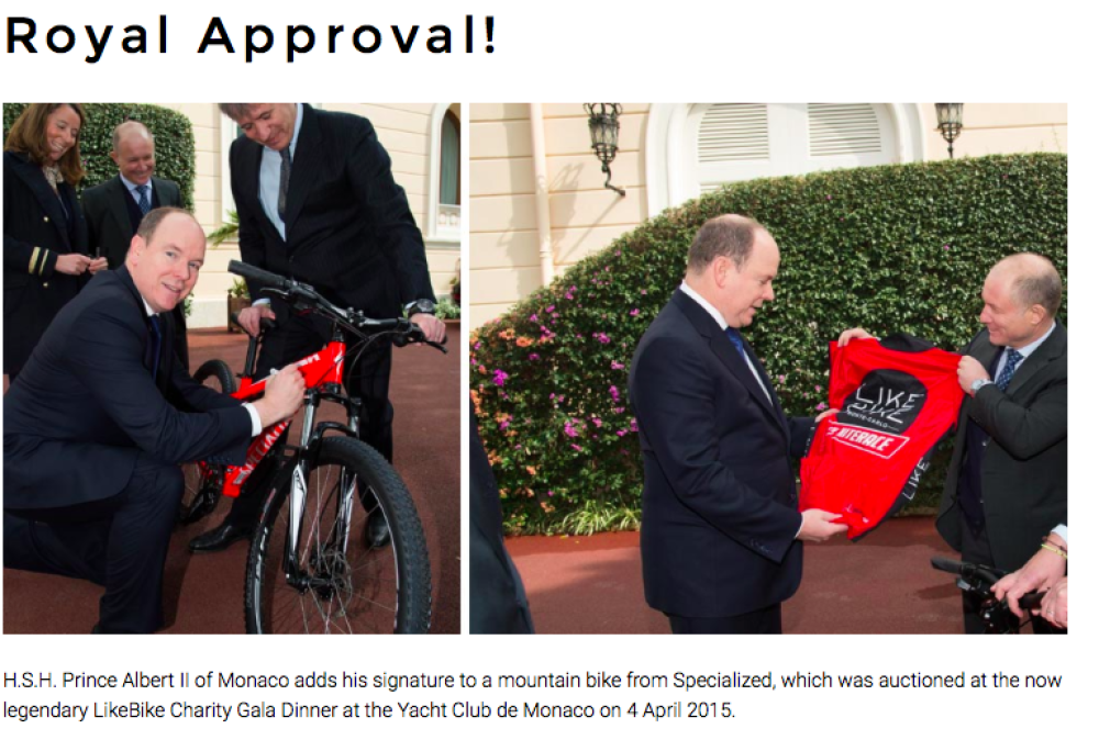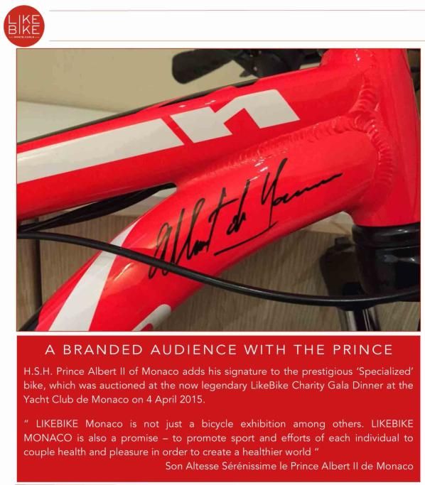 LikeBike gode dell’appoggio di S.A.S. il Principe Alberto II, che l’anno scorso ha prestato alcune biciclette della sua collezione per l’esposizione appositamente realizzata da LikeBike e che anche quest’anno rinnoverà questa esperienza. Il Salone, posto cronologicamente tra il Giro d’Italia e il Tour de France, accoglie molti professionisti del settore. La scorsa edizione può vantare oltre 4500 visitatori e 85 espositori. Quest’anno gli espositori saranno 120, con 14 anteprime mondiali. Sabato 4 giugno è in programma il gala benefico presso lo Yacht Club Monaco.