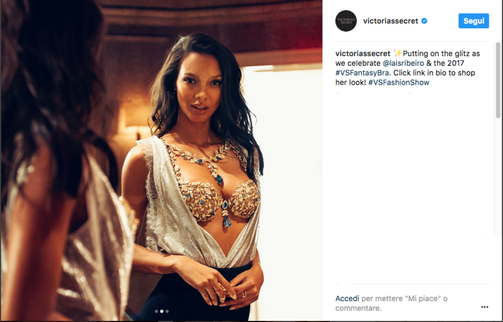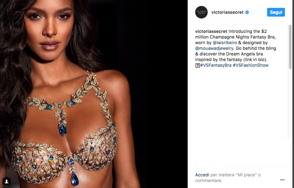 Il modello di quest’anno si chiama Champagne Nights Fantasy Bra e costa “appena” due milioni di dollari. La creazione si deve alla maison di gioielleria Mouawad, che non è nuova alle collaborazioni con Victoria’s Secret: questa è appunto l’undicesima.A sfoggiare il prezioso reggiseno il 20 novembre, sulle passerelle di Shanghai sarà la modella brasiliana Lais Ribeiro.