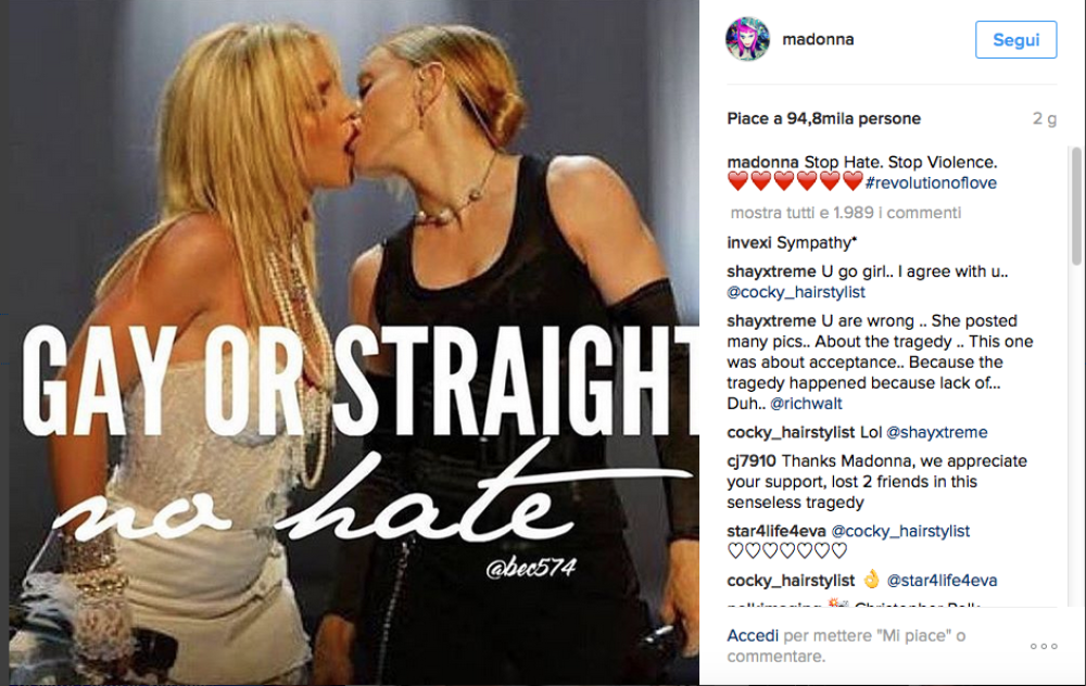 Madonna sembra non soddisfare molti con i suoi omaggi. Dopo essere stata criticata per il suo tributo a Prince durante i Billboard Music Awards, la star è finita nel mirino della critica anche per l’omaggio alle vittime della strage terroristica di Orlando. Domenica scorsa la cantante ha postato il messaggio: «Basta odio», accompagnandolo con un’immagine del famigerato bacio con Britney Spears in occasione degli Mtv Music Awards del 2003.
