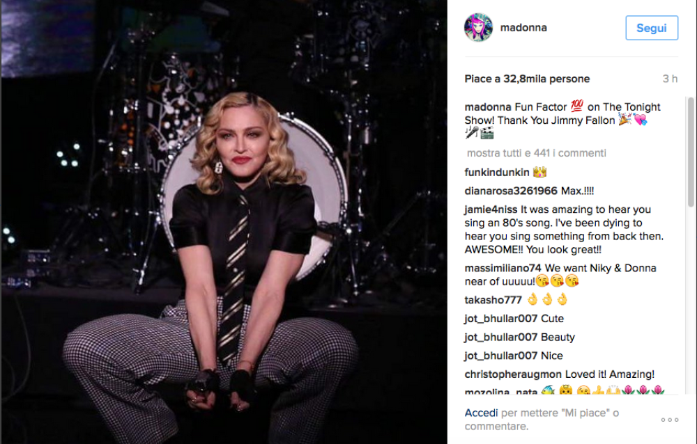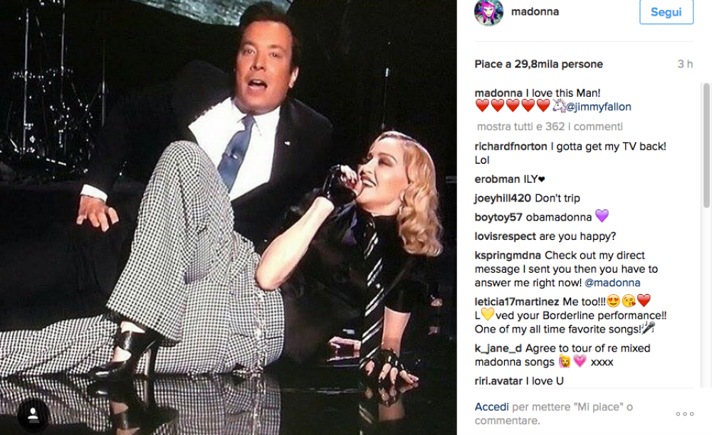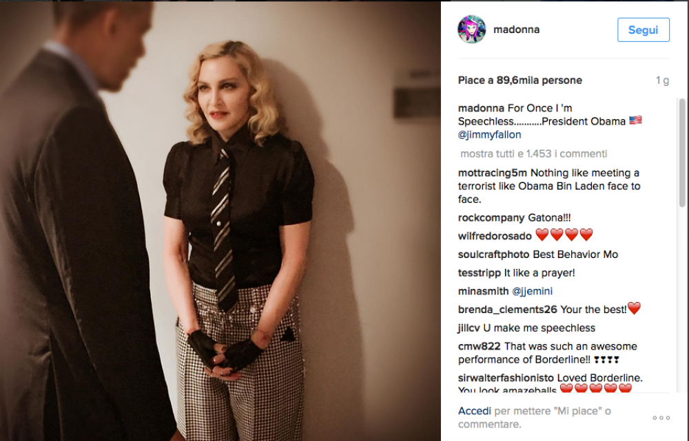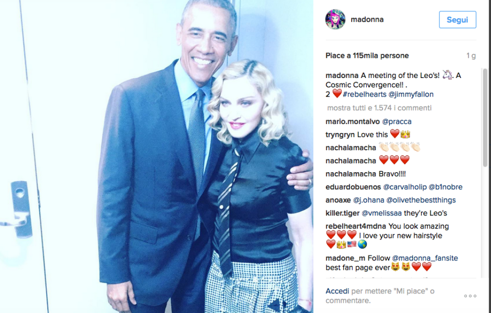 Madonna ha incontrato il presidente degli Stati Uniti Barack Obama in occasione della loro partecipazione al Tonight Show, il celebre show televisivo condotto da Jimmy Fallon e per una volta miss Ciccone ha dimostrato di essere in soggezione di fronte a uno degli uomini più influenti della mondo. La cantante ha postato infatti le foto del suo incontro e in una delle didascalia si legge: «Per una volta sono senza parole…il presidente Obama». Superato il timore reverenziale, Madonna ha avuto il coraggio di chiedere al presidente una foto insieme, anche questa finita su Instagram e definita «una convergenza cosmica».