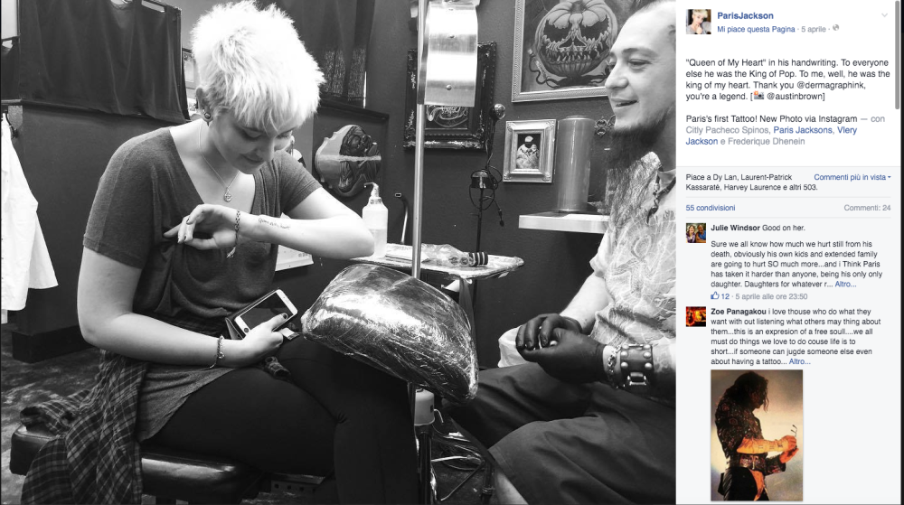 Ad accompagnare la foto questa didascalia: «Per tutti gli altri lui era il Re del Pop, per me, era il re del mio cuore». Del resto non è la prima volta che Paris prova a ricordare e a dimostrare il suo amore per il padre con un tatuaggio. A tre anni dalla scomparsa di Michael, quando la ragazza aveva solo 14 anni, aveva spiegato di volersi tatuare la scritta “29 agosto” sulla schiena in ricordo del compleanno del padre, nato proprio il 29 agosto del 1958.