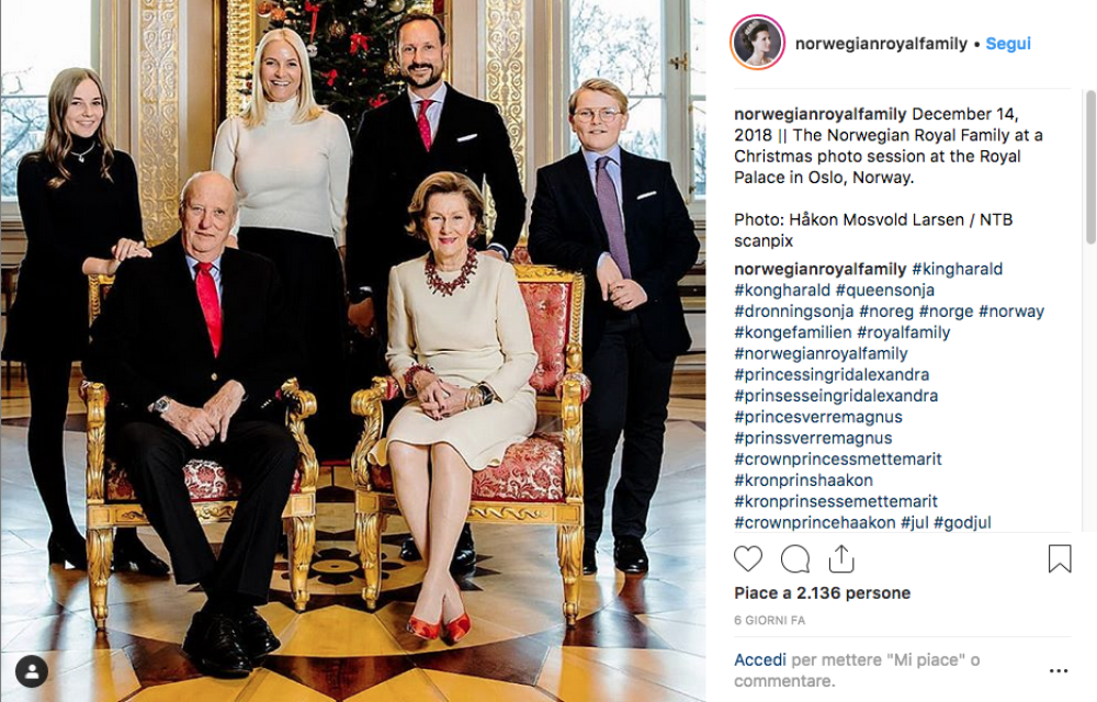 Nell’immagine ufficiale si vedono, felici e sorridenti, il Re Harald e la Regina Sonja. Non mancano naturalmente il Principe ereditario Haakon con la moglie Mette-Marit e i figli, la Principessa Ingrid Alexandra, 14 anni (destinata a diventare regina, seconda donna sul trono dopo Margherita I, morta nel 1412), e il Principe Sverre Magnus. Scenario regale, tra troni e ricchi arredi. Anche se la Famiglia Reale norvegese è alquanto anticonformista. Re Herald minacciò di rinunciare al regno pur di sposare Sonja, di origini borghesi. E il figlio, Principe Haakon, ha sfidato l’opinione pubblica sposando Mette-Marit, che aveva alle spalle una storia di tossicodipendenza e un figlio.