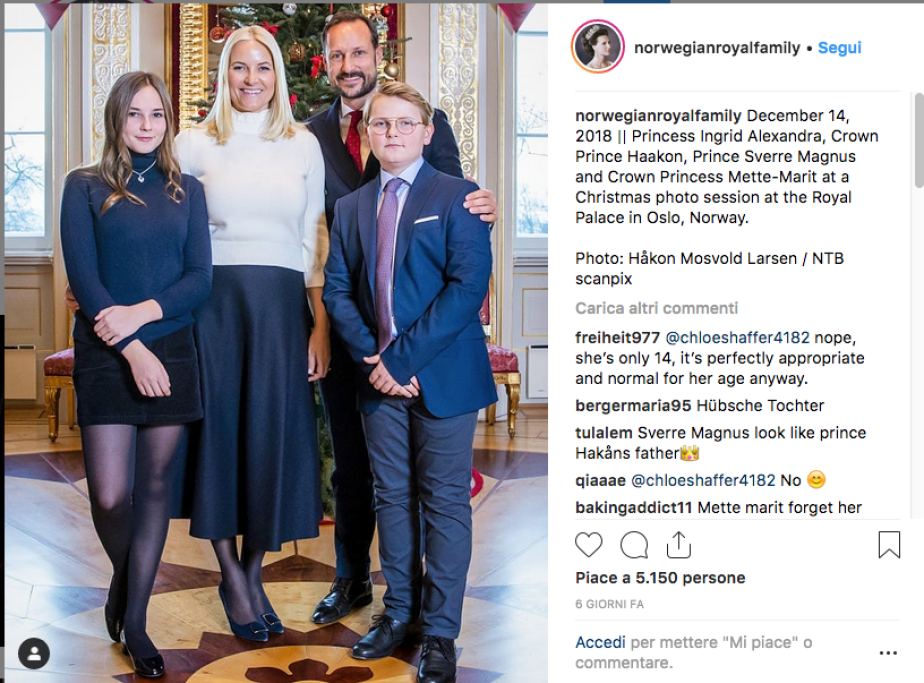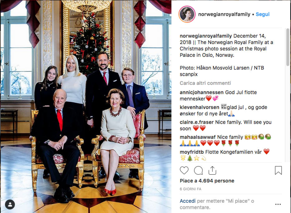 Alla tradizione della cartolina augurale natalizia non si è sottratta la Famiglia Reale di Norvegia. Così, dopo i saluti dalla campagna del Principe William, Kate e Royal Baby, lo scatto festoso del Principe Harry e Meghan con i fuochi d’artificio, la foto familiare del Principe Alberto, della Principessa Charlene e dei gemellini, ecco anche gli auguri della Famiglia Reale norvegese.
