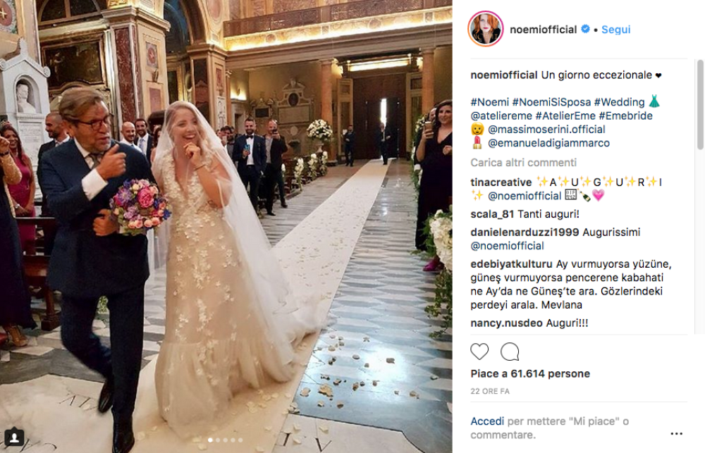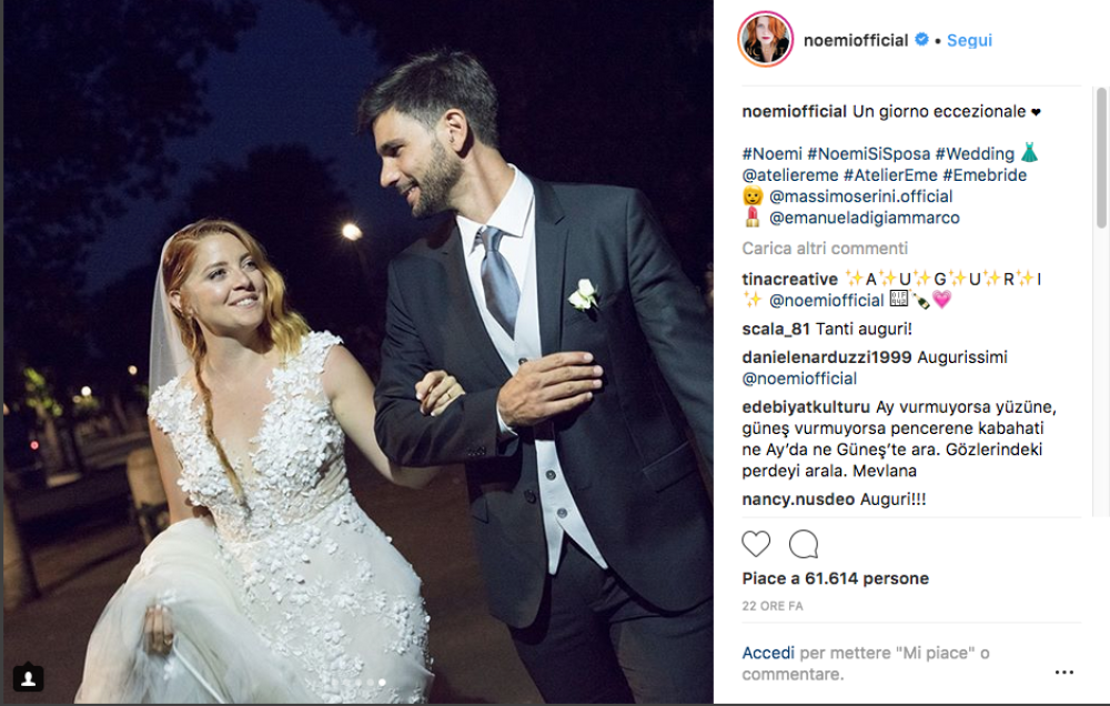 Dopo la cerimonia gli sposi si sono dedicati a una serata in musica: alla festa di nozze era presente, tra amici e parenti, anche Morgan, giudice che l’ha portata alla vittoria a X Factor 2008 e che le è stato vicino anche negli anni successivi della sua carriera musicale. E’ stato proprio lui ad accompagnarla alla batteria nel duetto in cui Noemi ha cantato “Altrove”, un brano dei Bluvertigo.