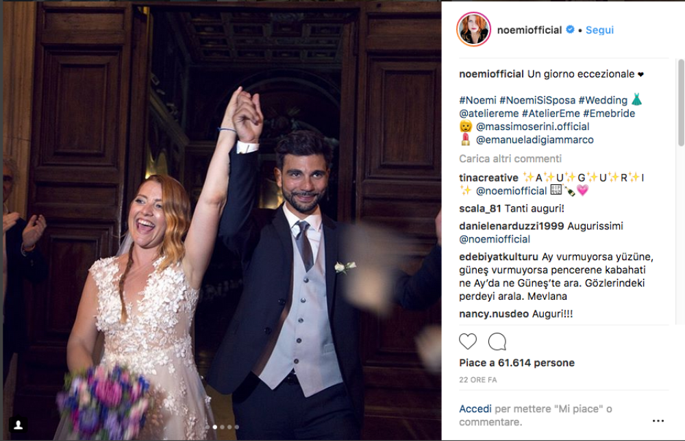 Noemi ha scelto la sua città per celebrare il grande “sì”, che l’ha unita in matrimonio a Gabriele Greco, il bassista con cui era fidanzata da 10 anni. Le loro nozze sono state festeggiate in un locale del Lungotevere il 20 luglio, dopo aver celebrato la funzione nella chiesa di San Lorenzo in Lucina, nel cuore del centro storico romano.