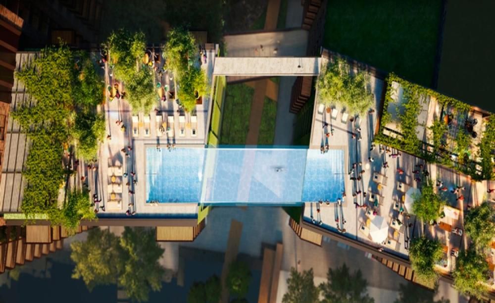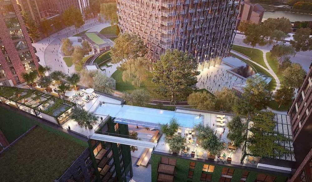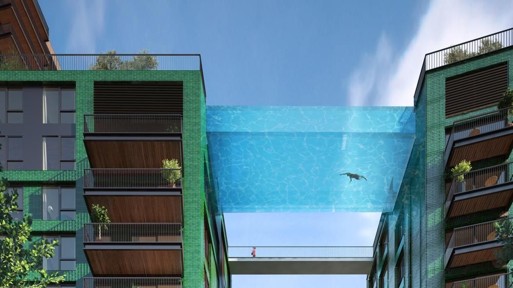Sky Pool è la piscina che collegherà due palazzi dell’Embassy Gardens di Londra, sarà sospesa a 35 metri di altezza sulle strade di Nine Elms.