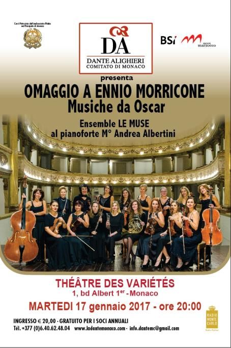 Appuntamento il 17 gennaio alle 20, al Théâtre des Variétés, per un imperdibile appuntamento della stagione della Dante Alighieri di Monaco. Si intitola “Musiche da Oscar: omaggio a Ennio Morricone“. Il Maestro è stato insignito del Premio Oscar nel 2016 per il film di Quentin Tarantino “The Hateful Eight” e dell’Oscar alla carriera nel 2007. A eseguire un memorabile omaggio al grande compositore sono l’ensemble tutto al femminile Le Muse (che ha rappresentato l’eccellenza musicale italiana nel luglio 2016 all’inaugurazione del semestre di presidenza italiana presso l’Unione Europea). La formazione per l’occasione si è arricchita grazie all’apporto di sei musicisti classici e della vocalist Angelica De Paoli). Guidate dal maestro Andrea Albertini, Le Muse eseguono un repertorio selezionato dalla ricchissima produzione di Morricone. L’appuntamento è reso ancora più suggestivo grazie alla proiezione di una serie di immagini e spezzoni di film che accompagneranno le colonne sonore proposte. Durante l’incontro saranno rivelati anche aneddoti e curiosità.