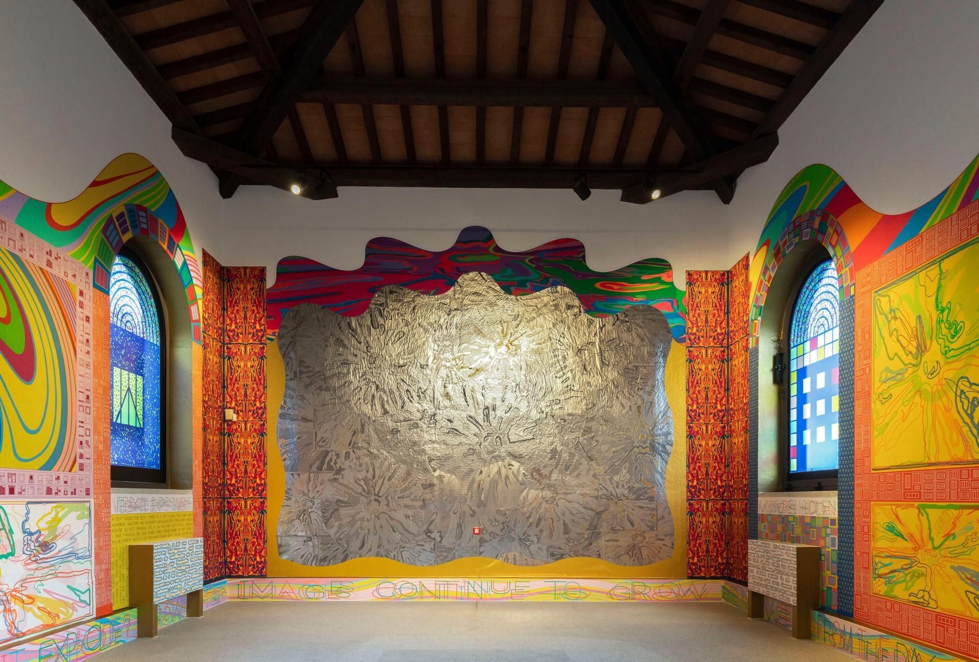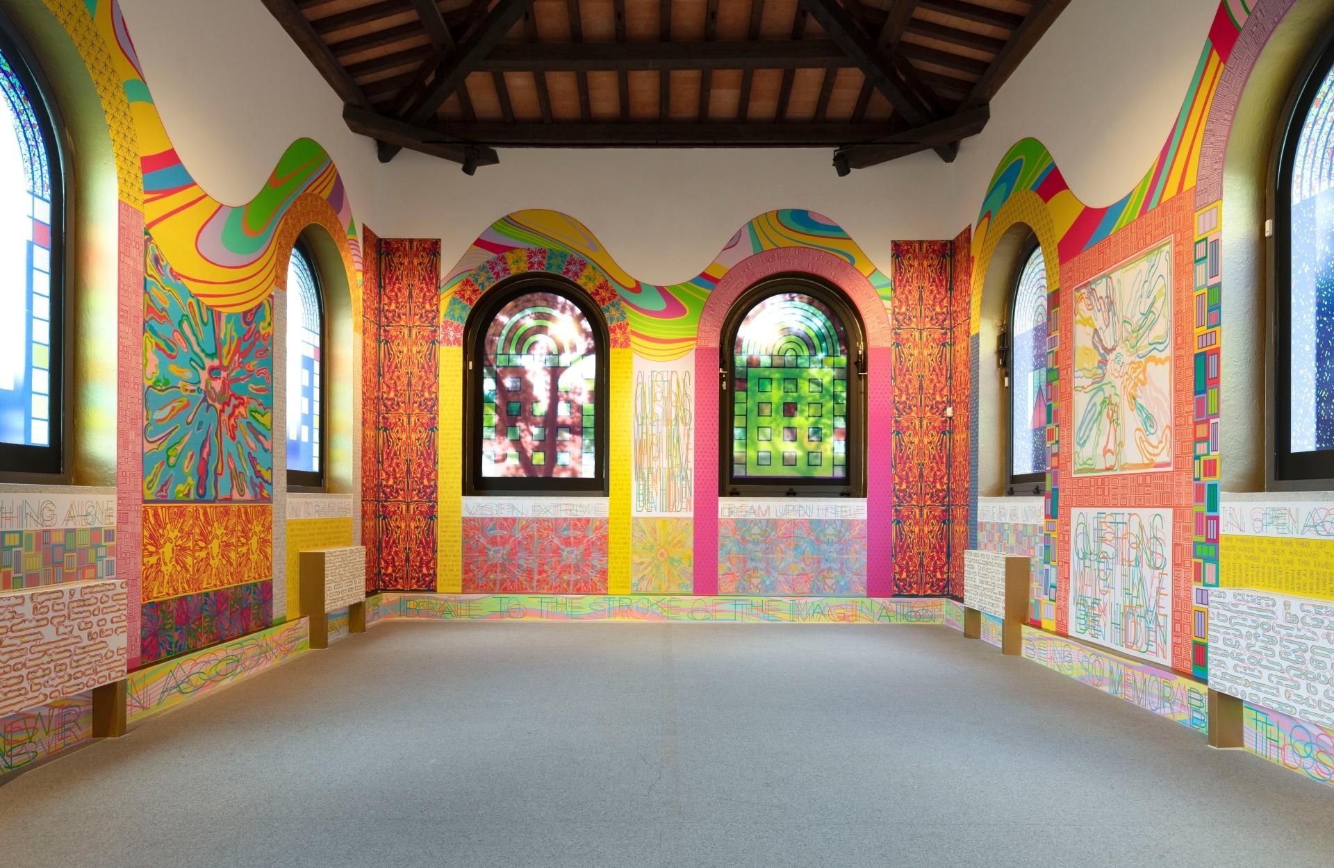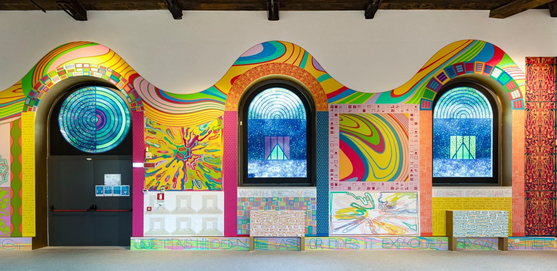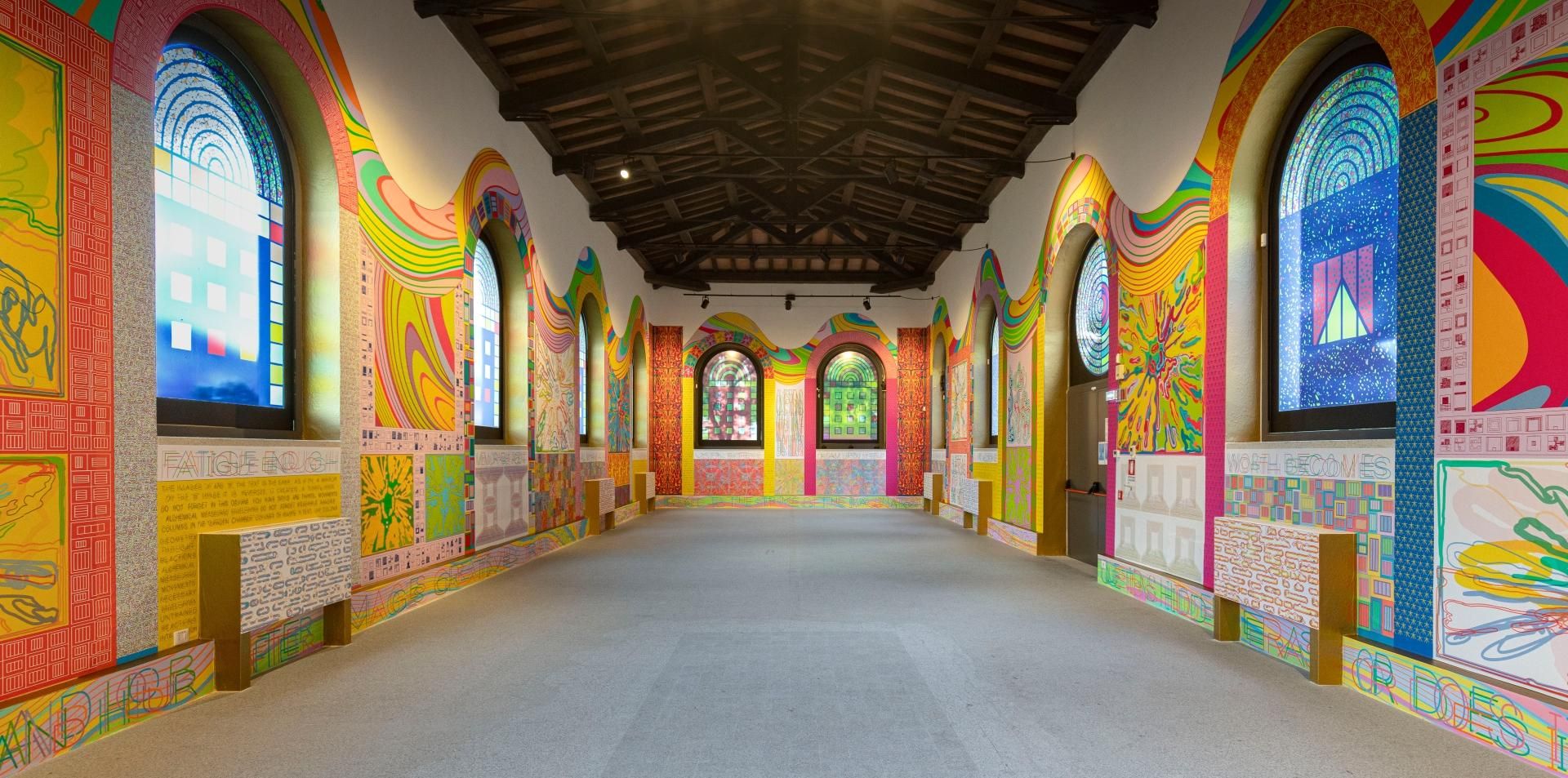 Nell’antico lavatoio del paese usato dal museo per le mostre temporanee Peter Halley ha dato vita a installazioni dal tono gioioso e vivace.