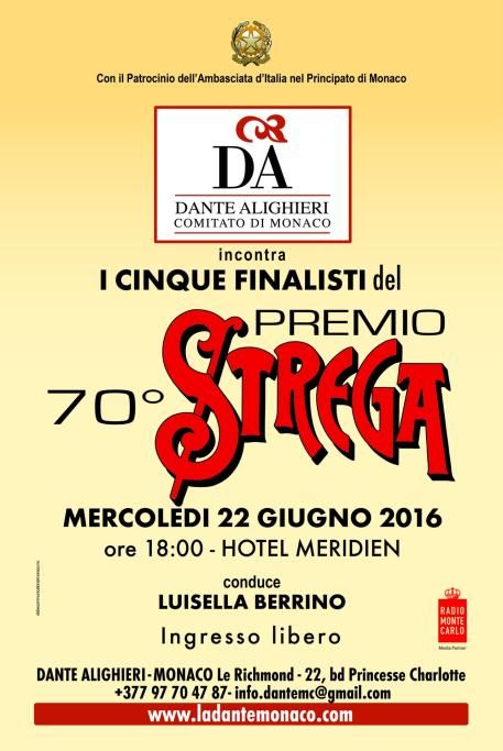 È mercoledì 22 giugno il giorno in cui i cinque finalisti del prestigioso premio letterario Strega saranno ospiti, presso l’Hotel Meridien, del Comitato Dante Alighieri di Monaco, per una conferenza/incontro condotta dalla giornalista Luisella Berrino. Un evento davvero significativo per il Comitato Dante Alighieri che, per la prima volta è entrato a far parte (n qualità di comitato estero), del voto collettivo del Premio Strega.