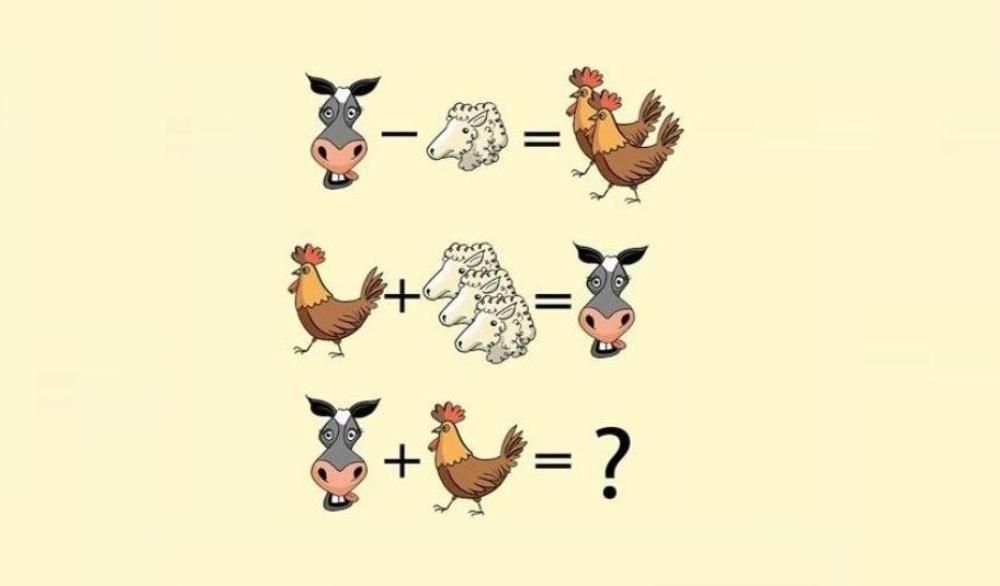 Una mucca = 10; una pecora = 2 e una gallina = 4. Quindi, 1 mucca + 1 gallina = 14 (o 7 pecore !)