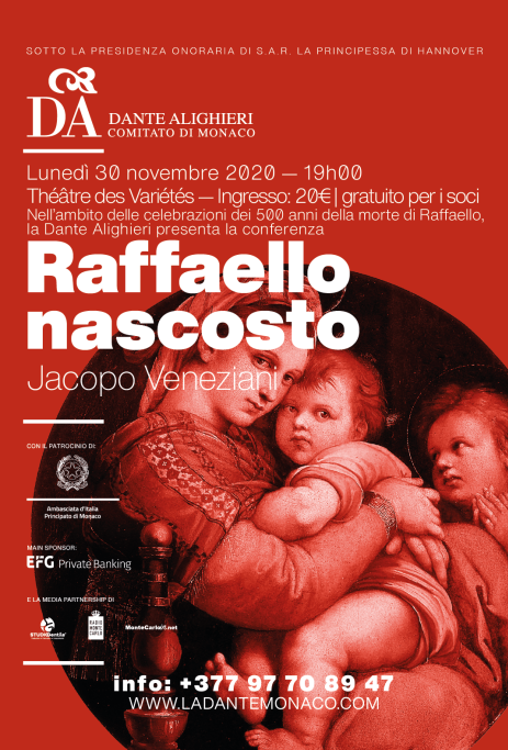 Per ricordare il genio e il talento di Raffaello la Dante Monaco presenta lunedì 30 novembre, al Teatro des Variétés una imperdibile conferenza affidata a Jacopo Veneziani, che insegna Storia dell’Arte all’Università di Parigi I Panthéon-Sorbonne e ha una sua finestra all’interno della rubrica settimanale dedicata alla storia dell’Arte nel programma -Le parole della settimana- condotto il sabato sera da Massimo Gramellini su Rai Tre.