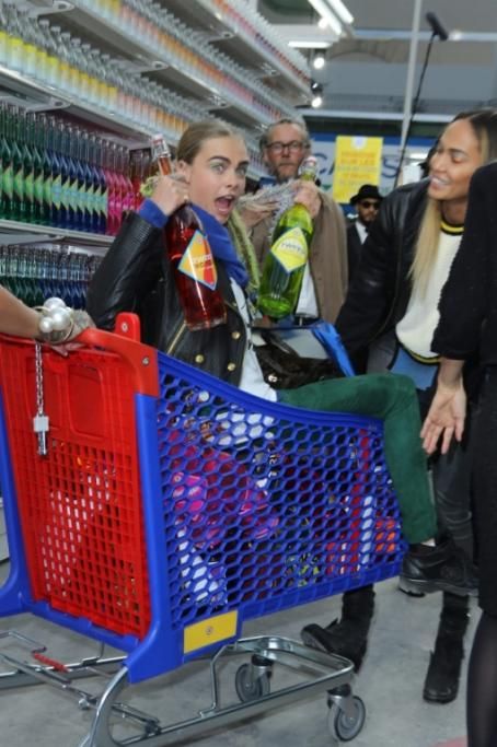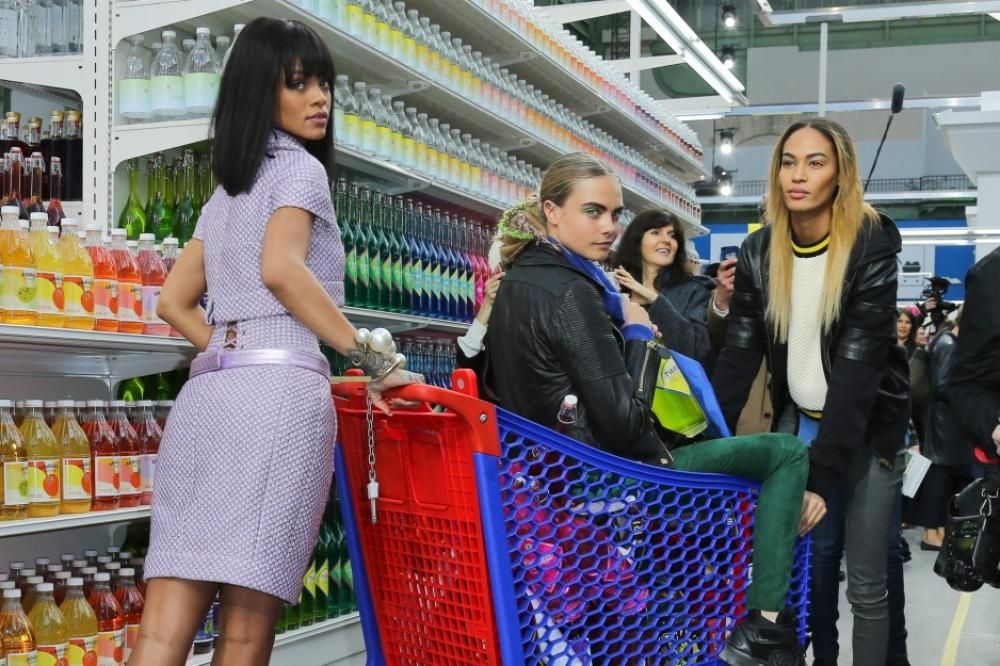 L’artista non resiste alla tentazione e scherza sul set della sfilata parigina Autunno/Inverno di Chanel, ambientata in un (ipotetico) supermercato. Con lei le modelle Cara Delevingne e Joan Smalls