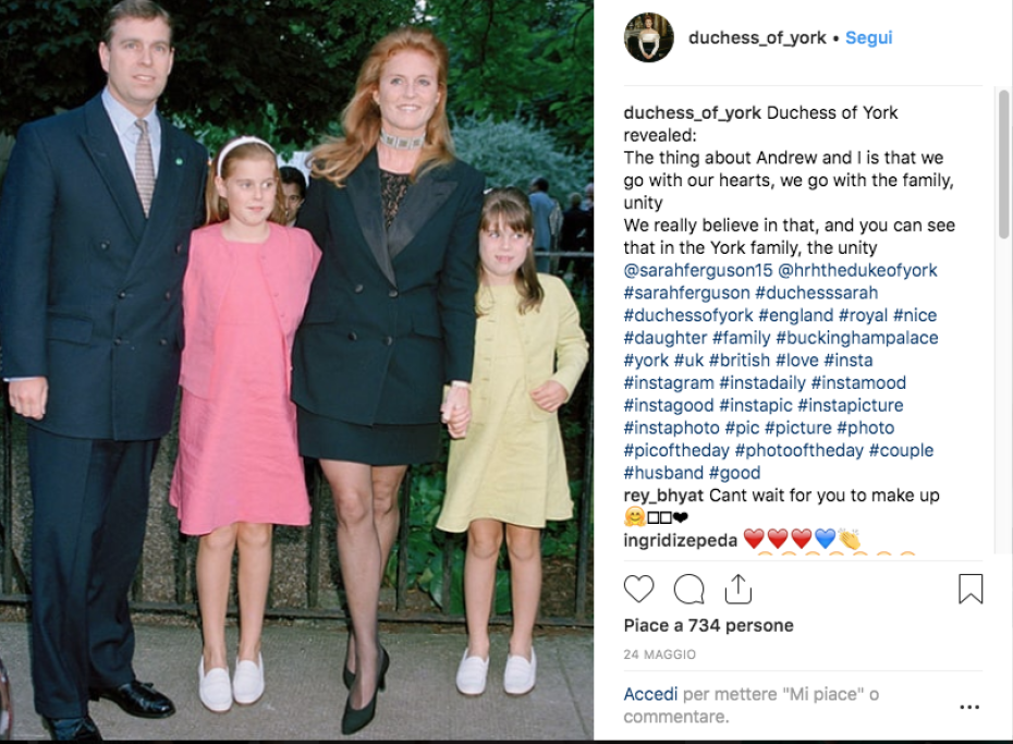 Sembra ieri (ma era il 23 luglio 1986) quando una trepidante Sarah, in tiara regale e abito color avorio, entrava nell’Abbazia di Westminster per sposare il Principe Andrea. Erano poi venuti gli scandali e il divorzio (nel 1996). Adesso, questo periodo buio sembra superato. E perfino il Principe Filippo, allora il più risentito per il comportamento poco regale di Sarah, ha abbandonato ogni rancore nei suoi confronti e si dimostra indifferente.