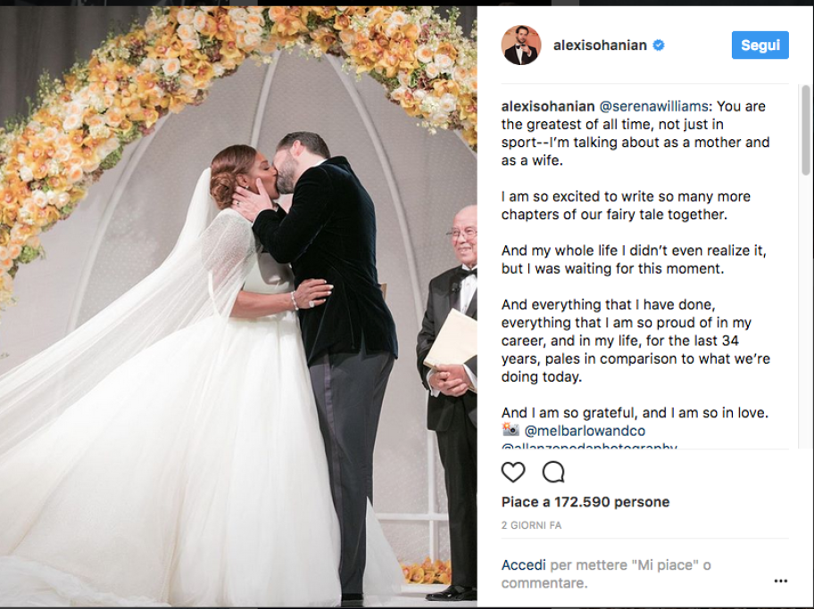 Il primo incontro tra Serena e Alexis era avvenuto per caso a Roma. Entrambi erano nello stesso hotel, il Cavalieri, entrambi avevano sentito parlare della meravigliosa colazione servita al mattino ed entrambi erano però arrivati troppo tardi, quando la sala buffet era già chiusa. Si erano così spostati ai tavoli vicino la piscina per ordinare qualcosa dal menu. Inizialmente Serene era infastidita dall’avere accanto uno sconosciuto, e una sua amica aveva provato a spaventarlo, dicendo che c’era un topo accanto al suo tavolo. Ma Ohanian non si era affatto turbato, aveva scherzato con la tennista e si era perfino meritato un invito a raggiungerla a Parigi, dove Serena avrebbe disputato dei match. Era sbocciato l’amore, era poi nata, il 1 settembre di quest’anno, la piccola Alexis Olympia (che vanta già 105.000 follower su Instagram). E adesso, le nozze a tema fiabesco…