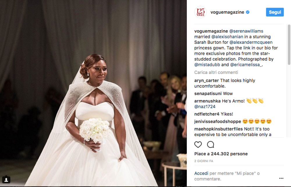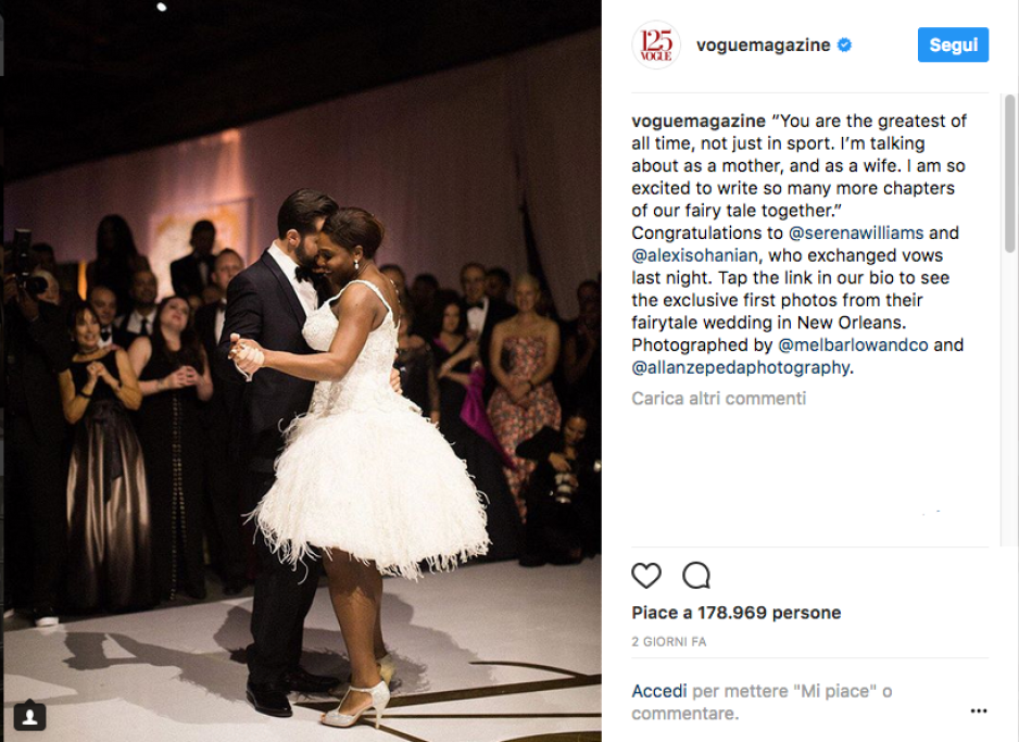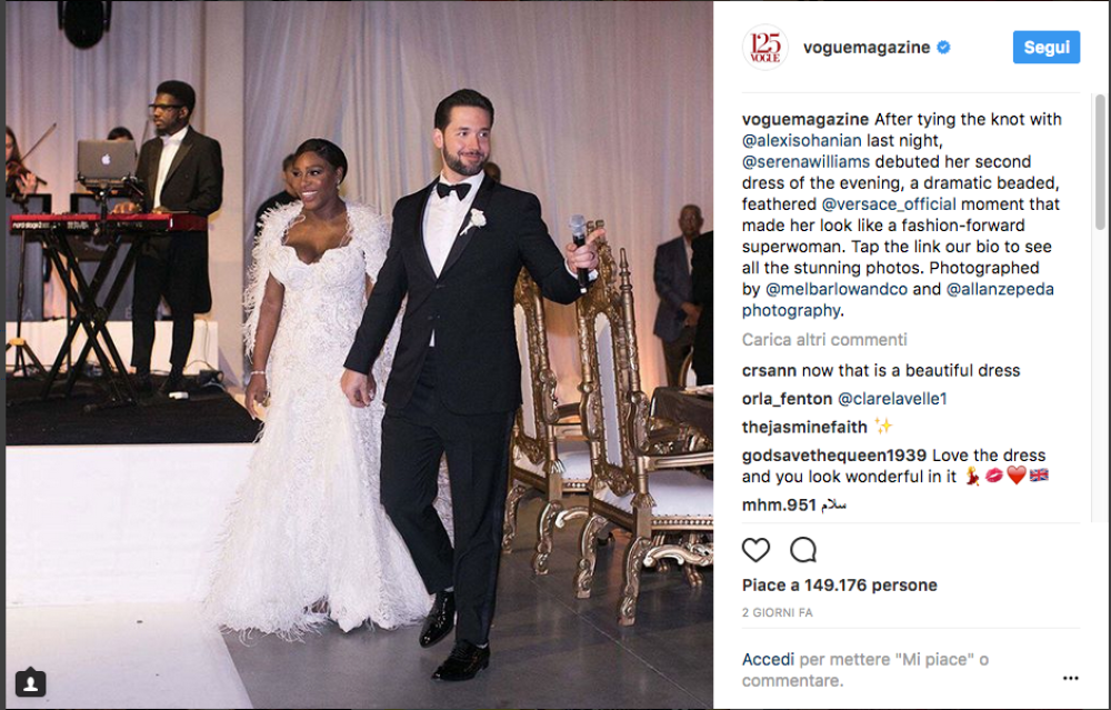 Serena Williams ha sposato il fidanzato Alexis Ohanian, creatore della piattaforma on line Reddit, il 16 novembre a New Orleans, al Contemporary Arts Center.