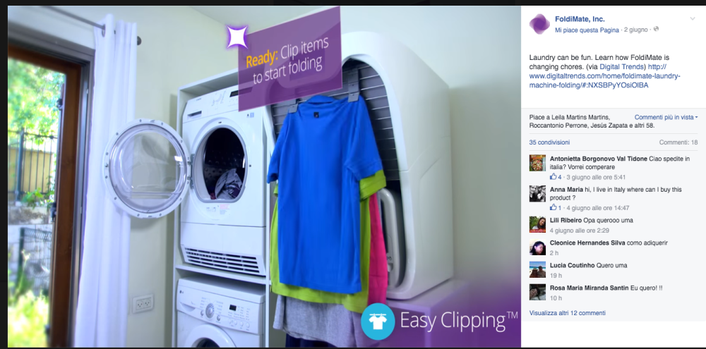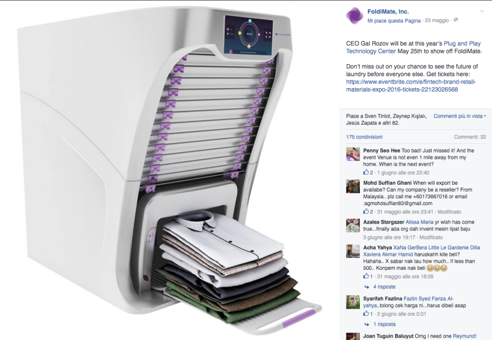 Stirare senza fatica, anzi, avere camicie e capi d’abbigliamento perfettamente in piega… senza muovere un dito? Non è un sogno. Nel 2018 sarà possibile. È questa infatti la data di messa in commercio di una nuova macchina, Foldimate, che si occupa di piegare e stirare a vapore la vostra biancheria, vaporizzandola anche con il profumo. La macchina sfrutta dei bracci meccanici e dei getti di vapore ed è facilissima da usare a detta dei produttori, che stanno raccogliendo sul loro sito le ordinazioni. Foldimate infatti non sarà pronta prima del 2018. Nell’attesa, eccovi alcune foto…