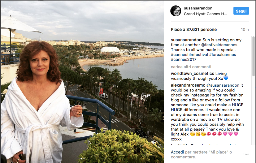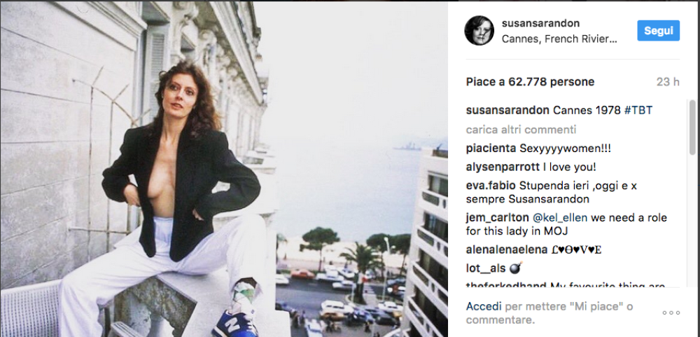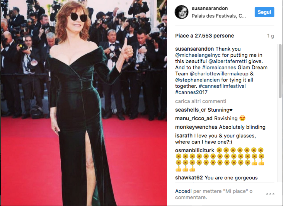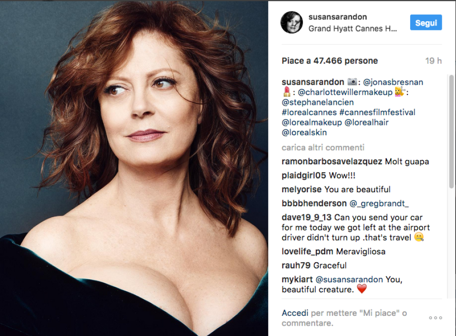 Eleganza strepitosa, spacchi vertiginosi, scollature da brivido: la Sarandon mostra come si fa a essere sensuali senza scadere nella volgarità e Vogue le ha tributato un commosso omaggio, dedicandole un articolo intitolato “Susan Sarandon è la davvero la prova che i 70 sono i nuovi 20”, in cui le cifre si riferiscono chiaramente agli anni. Il segreto della Sarandon? Autostima, cura di sé e anche un pizzico di fortuna: avere buoni geni fa la sua parte… Mai come quest’anno comunque il Festival di Cannes è un vero inno alle donne affascinanti senza badare all’età anagrafica. Basti pensare alla madrina della manifestazione, la raggiante Monica Bellucci, più che cinquantenne, o ad altre star ospiti della rassegna, da una luminosa Vanessa Redgrave (80 anni) alla sempre incantevole Isabelle Huppert (64 anni). A dimostrazione che bellezza e stile non sono riservati esclusivamente alle ventenni…