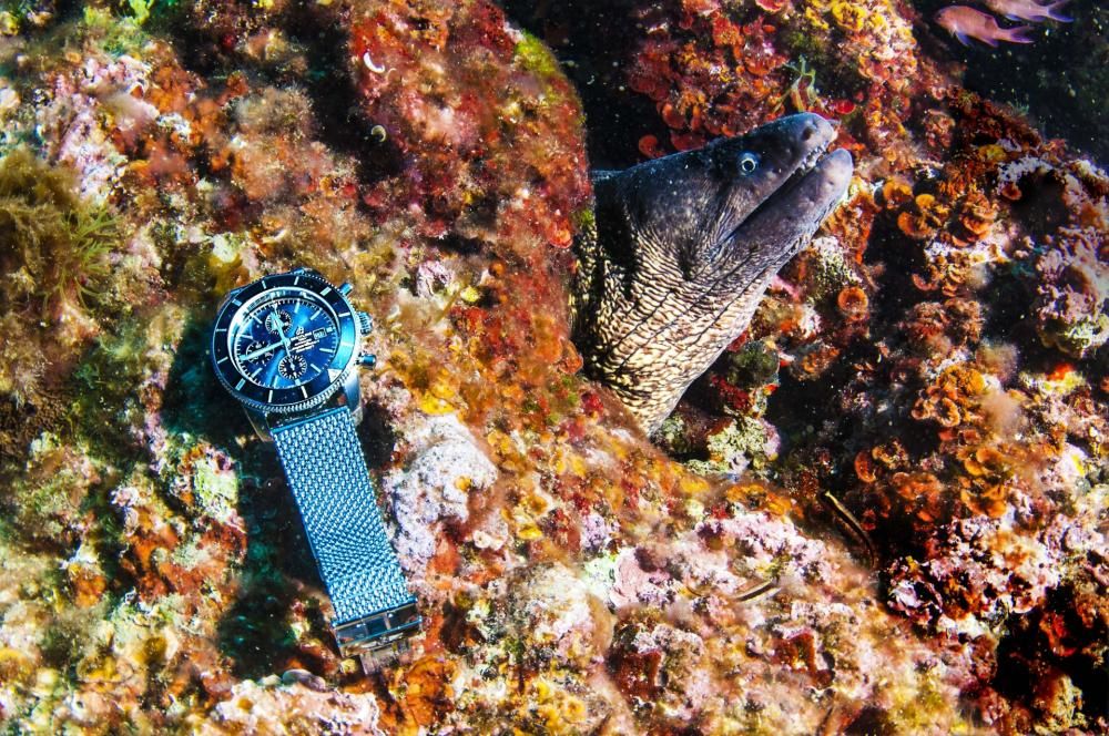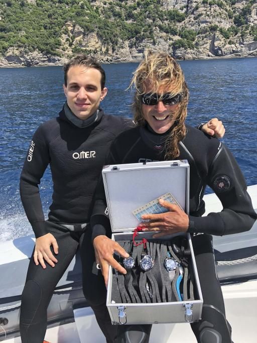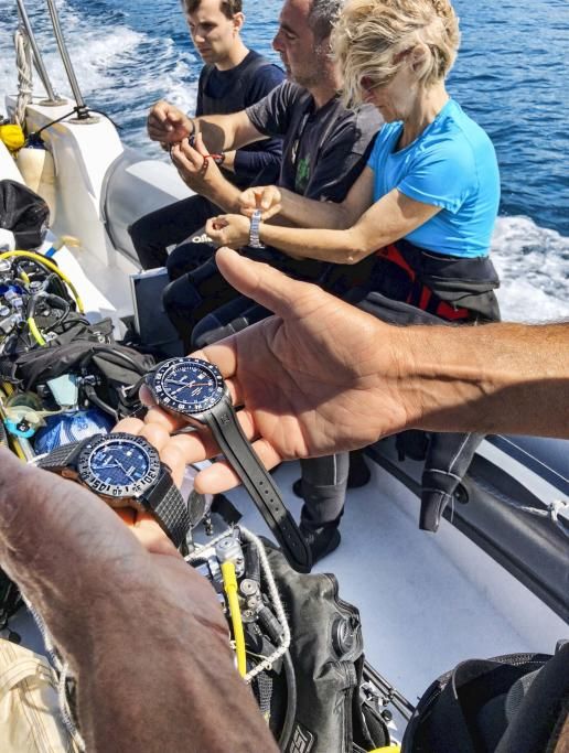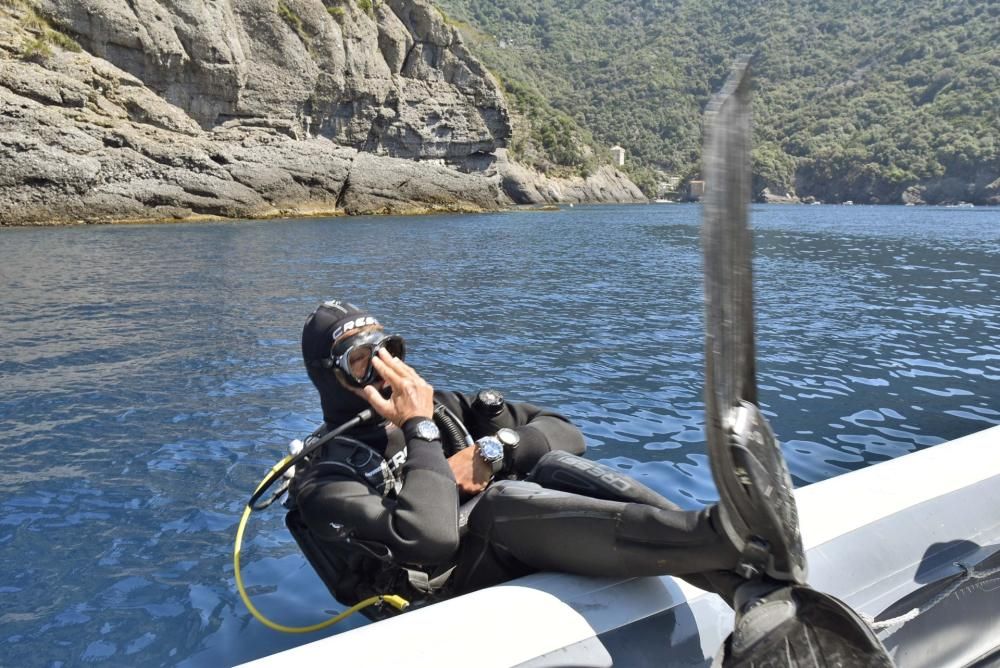 Eccoci dunque al tuffo che Arbiter ha effettuato per testare sul campo nove modelli di segnatempo subacquei, tutte novità del 2018: Audemars Piguet Royal Oak Offshore Diver, Bell & Ross BR03-92 Diver Blue, Breitling Superocean Heritage II B01 Chronograph, Eberhard & Co. Scafograf Gmt The Black Sheep, Jaeger-LeCoultre Polaris, Omega Seamaster Diver 300 in versione con bracciale in acciaio e cinturino in caucciù, Oris Divers Sixty-Five Bronze Bezel, Paul Picot Plongeur Black Phantom e Ulysse Nardin Diver Deep Dive. Naturalmente altre case orologiere propongono esemplari validissimi ma questi sono gli ultimi usciti, lo stato dell’arte. Per la nostra casa editrice ormai può considerarsi una tradizione: questo infatti è il quarto tuffo nel blu in cui proviamo questi gioielli meccanici da polso. Alcuni di loro hanno le bombole nel Dna, altri contano più che altro su di un’ispirazione marina, ma di certo tutti sono pensati per funzionare sotto il pelo dell’acqua come e se possibile meglio che sopra. Quest’anno abbiamo voluto ripetere l’esperienza alla Torretta, sul promontorio di Portofino. Un angolo di Liguria che regala alcune tra le più belle immersioni e alcuni tra i più begli incontri del Mediterraneo, nel contesto di una riserva dove sguazzano cernie, corvine, barracuda, branzini, saraghi, orate, polpi e tanto altro. L’ambientazione adatta per mettere agevolmente sotto pressione gli orologi acquatici. Così, in una mattina di fine maggio dalla temperatura già estiva, dopo aver rimandato la spedizione di una settimana a causa di condizioni meteo sfavorevoli, ci siamo tuffati nelle acque della Torretta, che si trova sulla sinistra guardando l’emozionante abbazia benedettina di San Fruttuoso. La Torretta, insieme alla Torre Doria, serviva centinaia di anni fa all’avvistamento dei pirati, in difesa del borgo di San Fruttuoso. Temperatura dell’acqua in superficie 20 gradi, cioè fresca, che a 26 metri di profondità diventano 15. Fondamentale per l’operazione l’appoggio di un centro immersioni qualificato, in questo caso il Diving Evolution di Andrea Galliadi, di Santa Margherita Ligure, a qualche minuto di navigazione dal punto di immersione. I membri della squadra, tutti sub esperti, si sono immersi con allacciati ai polsi di ciascuno almeno un segnatempo meccanico, alcuni con ben due orologi. A immortalarci due fotosub di lungo corso: sott’acqua Massimo Corradi, istruttore di safari fotografico sub di cui ha vinto numerosi titoli nazionali e internazionali, e in barca Gianni Risso, detentore del primato come fondatore e presidente più longevo di un club subacqueo, il Cicasub Bogliasco Seatram dal 1963, nonché autore di 6mila articoli subacquei.