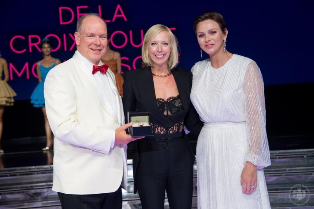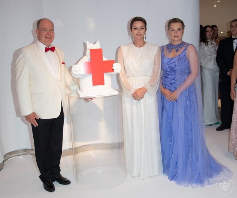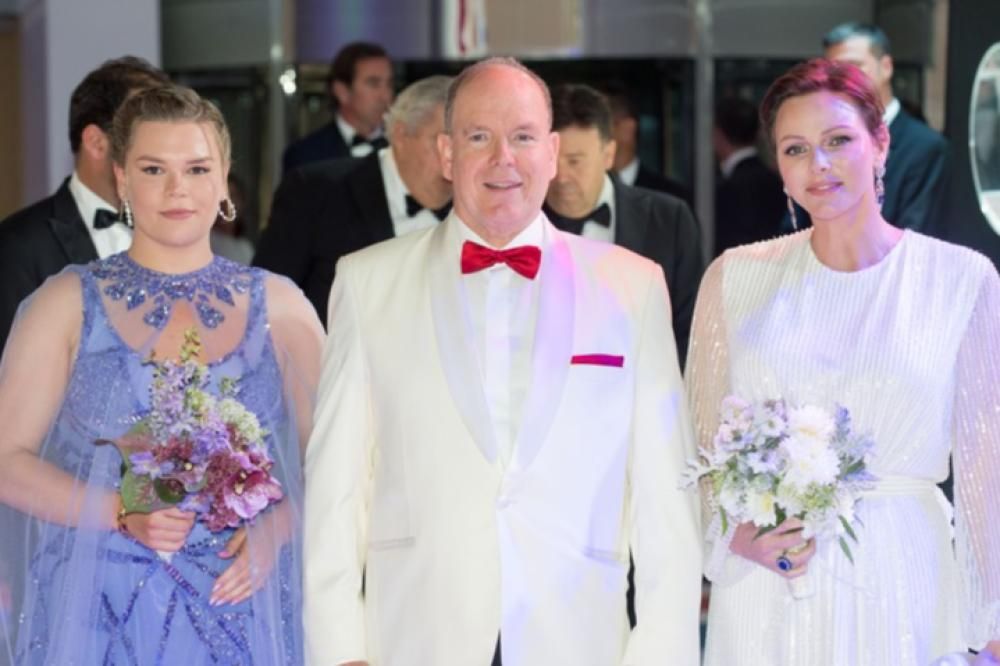 La Principessa di Monaco è sorridente, per la serata ha scelto di indossare un vestito bianco con paillette, in mano una pochette in tinta e un bouquet di fiori. Il taglio dei capelli è stile pixie, moderno e glamour, che va molto di moda superati i 40 anni. La Principessa ne ha 45. La serata comincia con un bel filmato dedicato alle attività della Croce Rossa Monegasca.