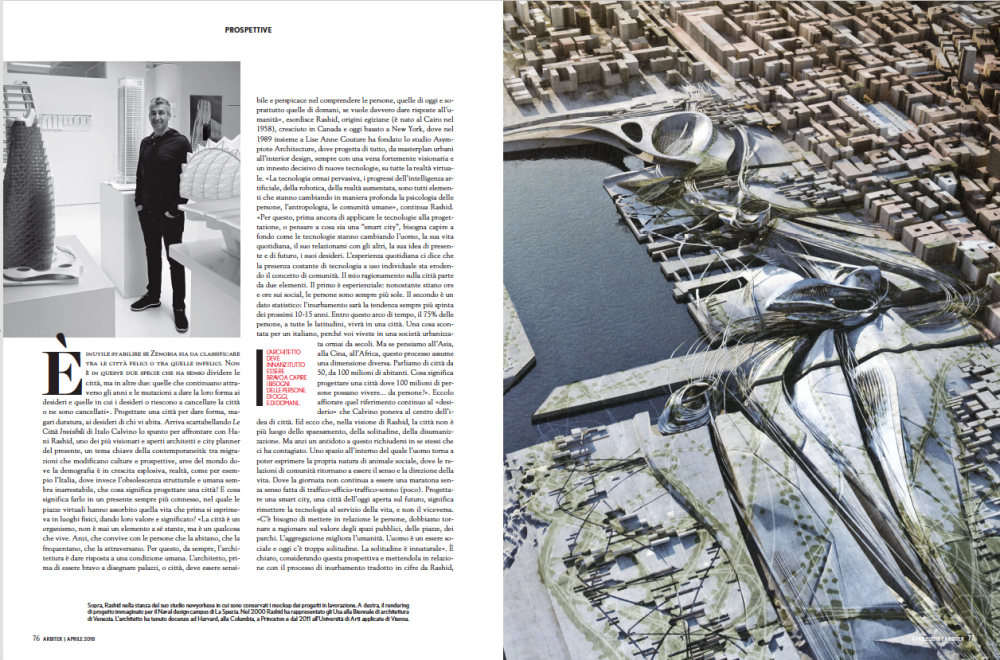 Non è in queste due specie che ha senso dividere le città, ma in altre due: quelle che continuano attraverso gli anni e le mutazioni a dare la loro forma ai desideri e quelle in cui i desideri o riescono a cancellare la città o ne sono cancellati». Progettare una città per dare forma, magari duratura, ai desideri di chi vi abita. Arriva scartabellando Le Città Invisibili di Italo Calvino lo spunto per affrontare con Hani Rashid, uno dei più visionari e aperti architetti e city planner del presente, un tema chiave della contemporaneità: tra migrazioni che modificano culture e prospettive, aree del mondo dove la demografia è in crescita esplosiva, realtà, come per esempio l’Italia, dove invece l’obsolescenza strutturale e umana sembra inarrestabile, che cosa significa progettare una città? E cosa significa farlo in un presente sempre più connesso, nel quale le piazze virtuali hanno assorbito quella vita che prima si esprimeva in luoghi fisici, dando loro valore e significato? «La città è un organismo, non è mai un elemento a sé stante, ma è un qualcosa che vive. Anzi, che convive con le persone che la abitano, che la frequentano, che la attraversano. Per questo, da sempre, l’architettura è dare risposta a una condizione umana. L’architetto, prima di essere bravo a disegnare palazzi, o città, deve essere sensibile e perspicace nel comprendere le persone, quelle di oggi e soprattutto quelle di domani, se vuole davvero dare risposte all’umanità», esordisce Rashid, origini egiziane (è nato al Cairo nel 1958), cresciuto in Canada e oggi basato a New York, dove nel 1989 insieme a Lise Anne Couture ha fondato lo studio Asymptote Architecture, dove progetta di tutto, da masterplan urbani all’interior design, sempre con una vena fortemente visionaria e un innesto decisivo di nuove tecnologie, su tutte la realtà virtuale.