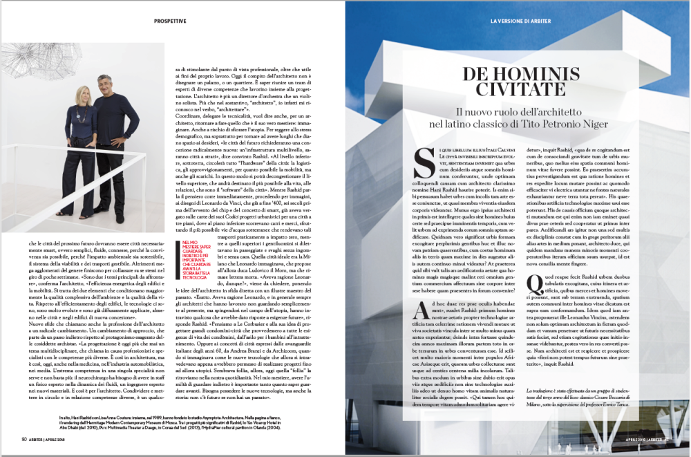Mentre Rashid parla il pensiero corre immediatamente, procedendo per immagini, ai disegni di Leonardo da Vinci, che già a fine ’400, sei secoli prima dell’avvento del chip e del concetto di smart, già aveva vergato sulle carte dei suoi Codici progetti urbanistici per una città a tre piani, dove al piano inferiore scorrevano carri e merci, sfruttando il più possibile vie d’acqua sotterranee che rendevano tali trasporti praticamente a impatto zero, mentre a quelli superiori i gentiluomini si dilettavano in passeggiate e svaghi senza ingombri e senza caos. Quella città ideale era la Milano che Leonardo immaginava, che propose all’allora duca Ludovico il Moro, ma che rimase lettera morta. «Aveva ragione Leonardo, dunque?», viene da chiedere, ponendo le idee dell’architetto in sfida diretta con un illustre maestro del passato. «Esatto. Aveva ragione Leonardo, e in generale sempre gli architetti che hanno lavorato non guardando semplicemente al presente, ma spingendosi nel campo dell’utopia, hanno intravisto qualcosa che avrebbe dato risposte a esigenze future», risponde Rashid. «Pensiamo a Le Corbusier e alla sua idea di progettare grandi condomìni-città che provvedessero a tutte le esigenze di vita dei condòmini, dall’asilo per i bambini all’intrattenimento. Oppure ai concetti di città espressi dalle avanguardie italiane degli anni 60, da Andrea Branzi e da Archizoom, quando si immaginava come le nuove tecnologie che allora si intravedevano appena avrebbero permesso di realizzare progetti fino ad allora utopici. Sembrava follia, allora, oggi quella “follia” la ritroviamo nella nostra quotidianità. Nel mio mestiere, avere l’umiltà di guardare indietro è importante tanto quanto saper guardare avanti. Bisogna possedere le nuove tecnologie, ma anche la storia: non c’è futuro se non hai un passato».
