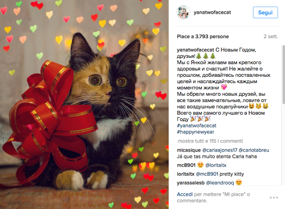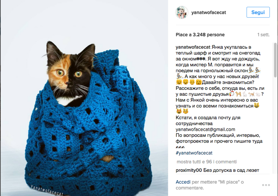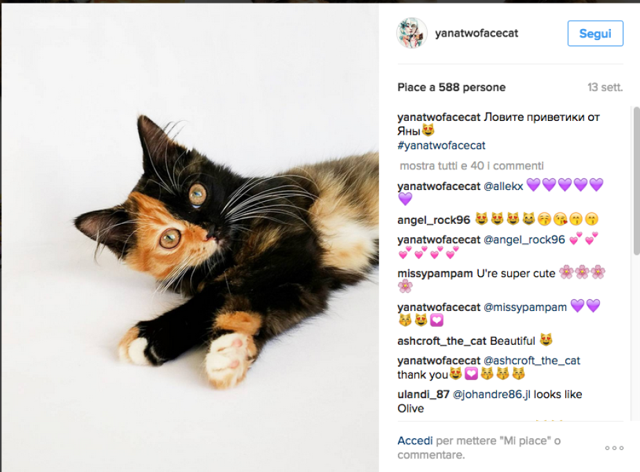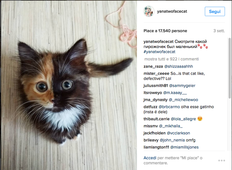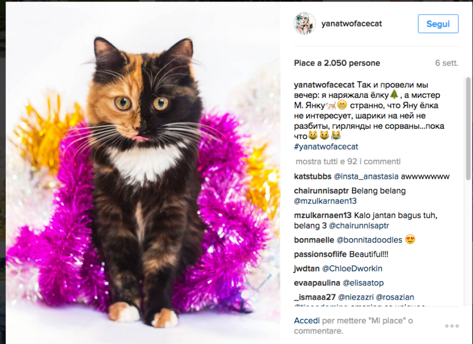 Yana è una gattina russa diventata celebre per una incredibile particolarità: il suo muso è infatti diviso esattamente in due metà, dai colori diversi: fulvo e nero. L’effetto sembra realizzato con Photoshop e invece è perfettamente naturale. Le immagini di Yana sono apparse su un sito russo nel luglio del 2016: la gattina era in cerca di un padrone. Da allora gli scatti del micio hanno conquistato il popolo del web. E Yana ha trovato una padrona affettuosa, che l’ha adottata e se ne prende cura.