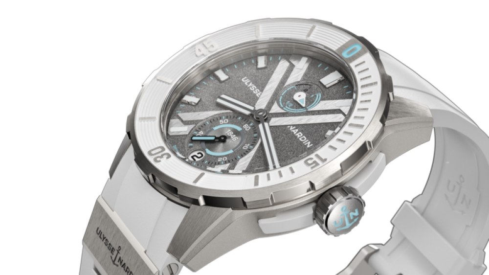 L’elemento brandizzato Ulysse Nardin si staglia al di sotto del quadrante sabbiato. La lunetta – in caucciù bianco – si combina perfettamente con il cinturino. Il suo movimento di manifattura UN-118 garantisce precision in qualsiasi emisfero, ad ogni ora del giorno e della notte. La superficie grigia del quadrante è segnata da una robusta ed elegante “X”. La corona e l’intera cassa sono in leggerissimo titanio.