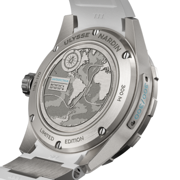 L’incisione sul fondello riproduce non solo le coordinate del continente antartico: latitudine 90° (senza longitudine, inutile per le terre situate all’estremo sud della Terra) ma anche con il tracciato della mitica regata in solitaria Vendée Globe, della quale Ulysse Nardin è diventato sponsor ufficiale.