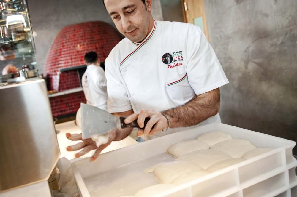 Sulla farina sarebbe d’uopo una digressione riguardante, invero, il tipo di raffinazione cui viene sottoposto il grano nel processo della molitura. Con il termine «farina» si indica un macinato di grano tenero, mentre per tutti gli altri tipi è necessario indicare l’alimento di provenienza, come ad esempio la farina «di mais». Dalla macinazione del grano tenero si ottiene una resa in farina tra il 70 e l’80%, mentre la restante parte è costituita da cruschello, farinaccio, granito e crusca. La farina 00 è quella più raffinata, più comune, e si ottiene dalla lavorazione della parte più interna del seme del grano. A livello intermedio si colloca la farina tipo 0, meno raffinata della 00 e utilizzata nella produzione del pane perché ricca di glutine; 0 e 00 hanno in comune purezza e candore: sono le più povere di proteine, sali minerali, vitamine e fibre e, per questo, sono notoriamente facili da lavorare. Con la farina 1 ci si addentra nella parte più esterna del chicco, così come con la 2, una farina semintegrale molto fibrosa e più grossolana in termini di consistenza, a lievitazione molto lenta. Sono entrambe ricche di sali minerali e vitamine e, quindi, anche di sapore. Ultima ma non ultima, infine, la farina integrale, molita ma non raffinata, già al tatto ha consistenza granulosa e contiene il più alto numero di nutrienti. Nel processo di manipolazione dell’impasto, tuttavia, non è poi così semplice equilibrare lieviti e farine. Un trucco indispensabile sarà allora quello di partire dall’acqua e solo dopo mettere la farina, sebbene i quantitativi siano a discrezione della sensibilità del pizzaiolo che dovrà considerare anche la forza della farina, ovvero la sua capacità di assorbire i liquidi e trattenere l’anidride carbonica durante la lievitazione.