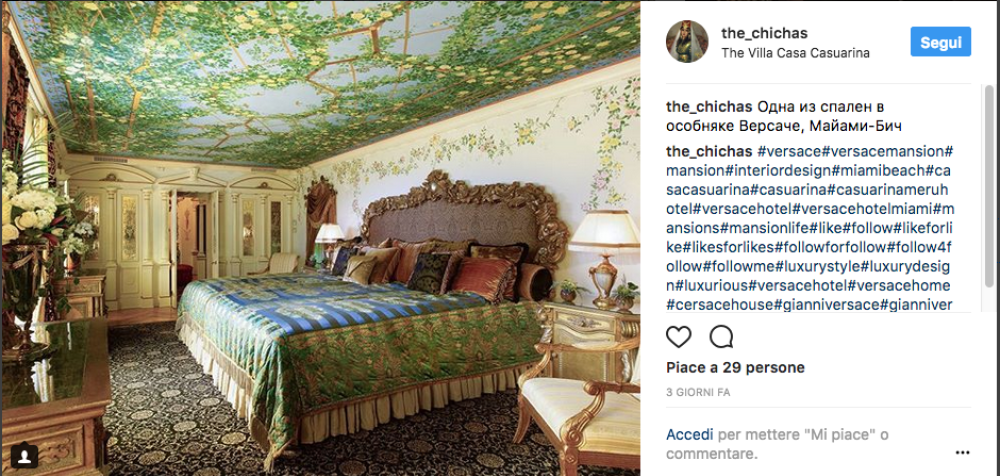 Situato nell’Art Déco Historic Districts, l ’hotel ha 10 suite. I turisti amano farsi fotografare davanti al suo ingresso. ma è dentro che la villa toglie il fiato, tra mosaici, fontane, piscine e lusso senza confini. Versace la acquistò per 2,95 milioni di dollari (circa 2milioni e mezzo di euro) e all’epoca la cifra fu considerata sbalorditiva. Per ristrutturarla secondo i suoi gusti, giardini, piscine, un osservatorio r fontane, furono spesi 27 milioni di euro. Si dice addirittura che la villa nasconda una capsula del tempo, occultata in uno dei suoi muri.