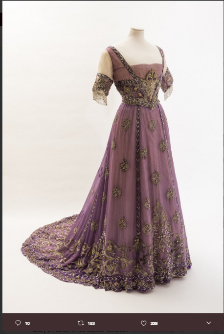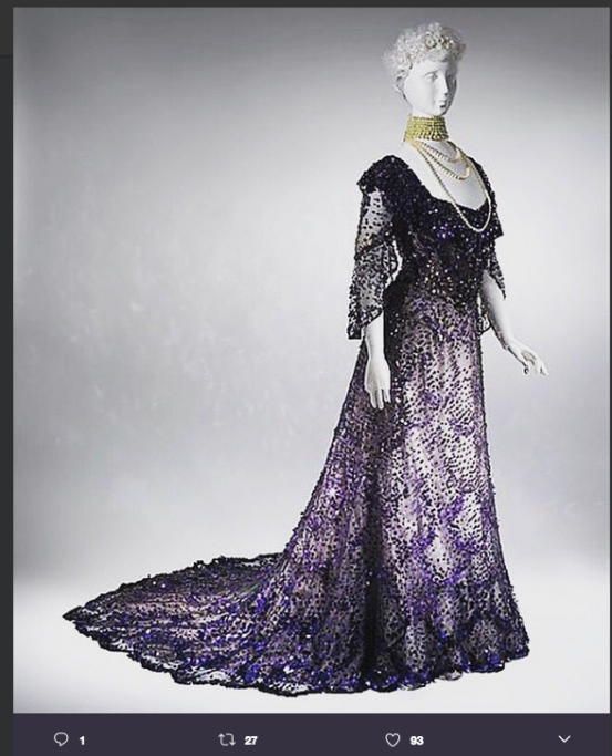 Vestiti mozzafiato, con alcune curiosità. Per esempio il pezzo forte della mostra è un incantevole abito color glicine, ricamato con insuperabile maestria. Era appartenuto alla Regina Alexandra, moglie di Edoardo VII e nuora della Regina Vittoria. Pare che la Regina Alexandra non lo abbia mai indossato. Alexandra fu Principessa del Galles per 37 lunghi anni e fu regina solo per dieci. Il lussuoso abito, destinato ai momenti più sontuosi della sovrana, probabilmente non fu usato e Alexandra, rimasta vedova, dovette ripiegare su completi più castigati e di colore nero.
