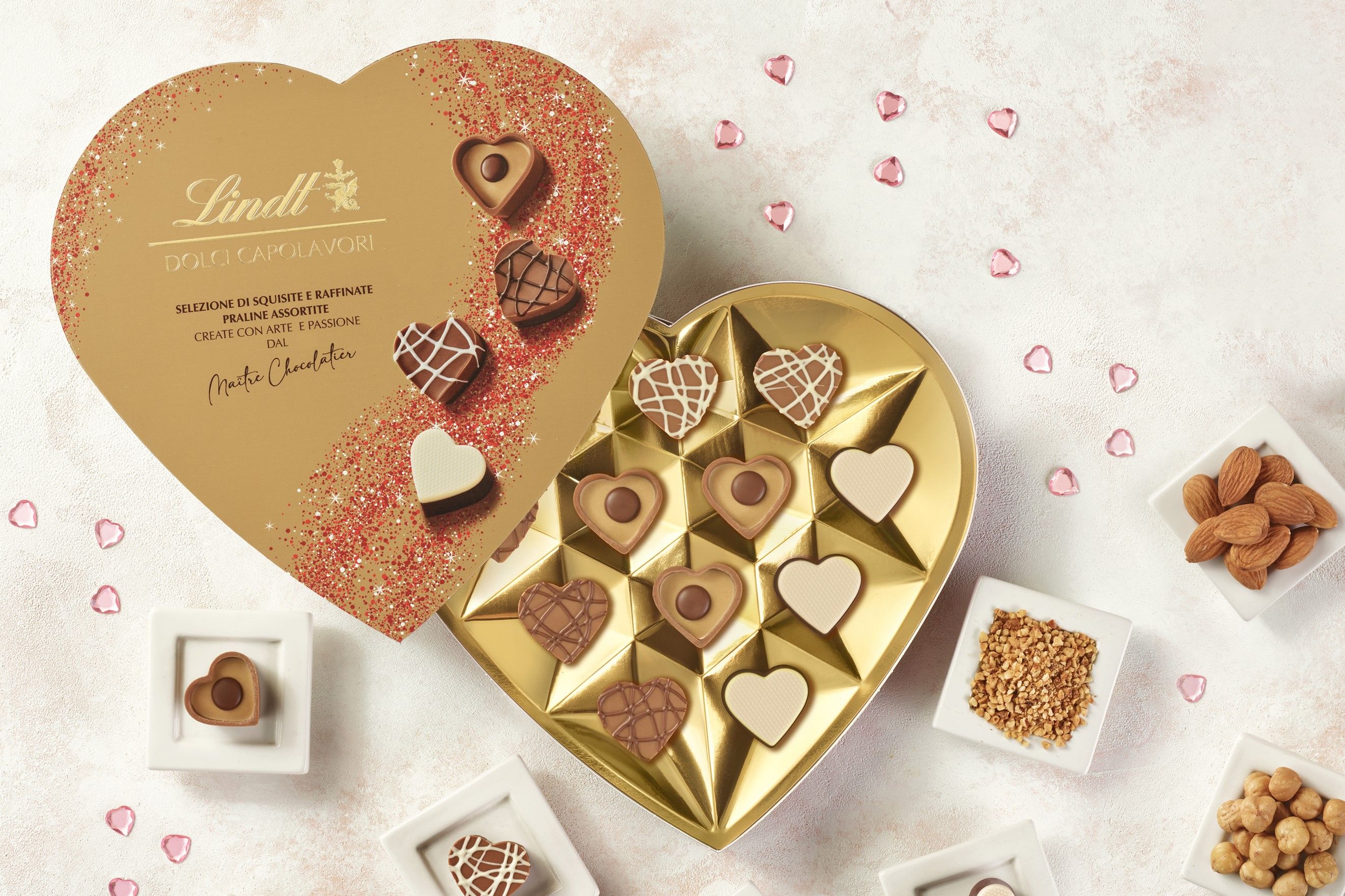 E ancora la raffinata Scatola Cuore Dolci Capolavori: un’elegante scatola a cuore che custodisce praline nude, espressione della creatività e dell’eccellenza dei Maîtres Chocolatiers Lindt.