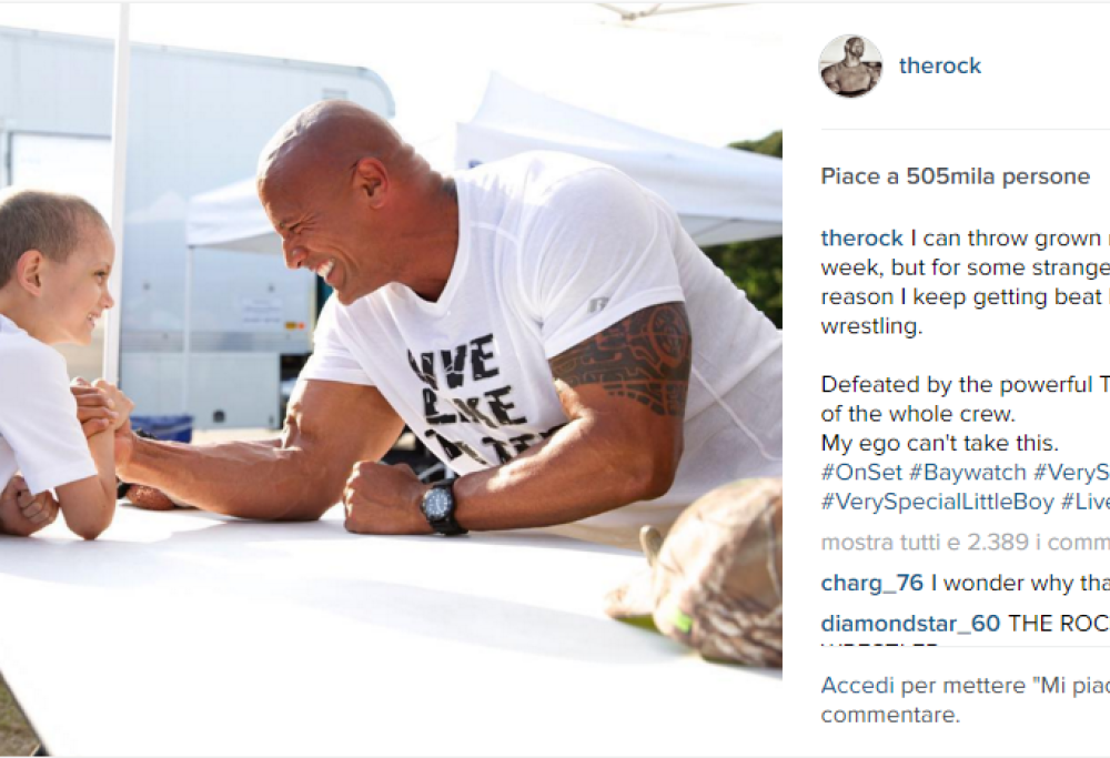 Dwayne “The Rock” ha documentato l’incontro pubblicando sul suo account Instagram un’immagine di sé stesso sconfitto da Gabriel a braccio di ferro.