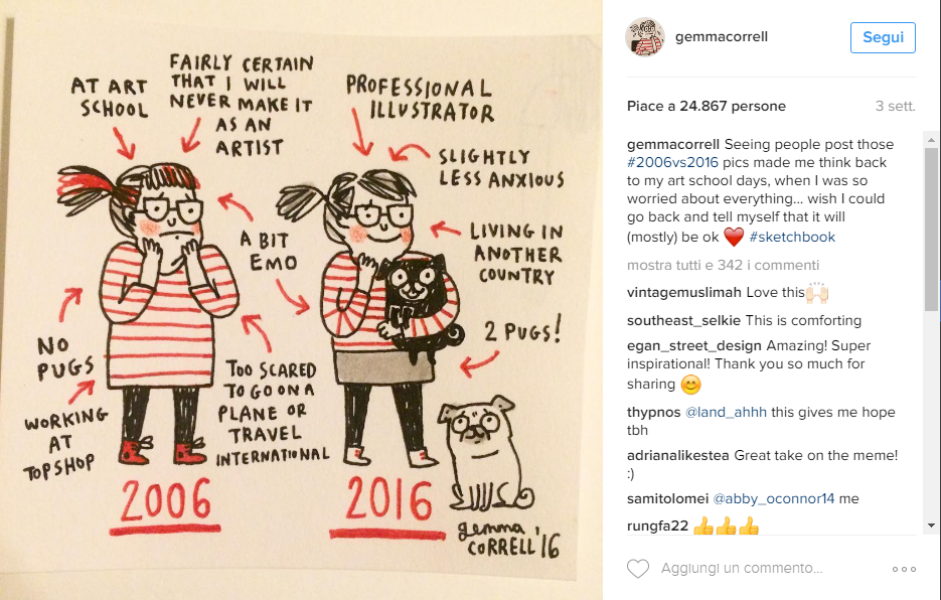 "Ho iniziato solo recentemente a condividere (su Instagram) queste vignette, negli ultimi tre o quattro anni", spiega Gemma. "Per un lungo periodo ho avuto paura di condividerli, li sentivo molto personali. Poi mi sono resa conto che attraverso la condivisione potenzialmente posso aiutare altre persone a comprendere la propria malattia o a dare una sorta di sollievo".