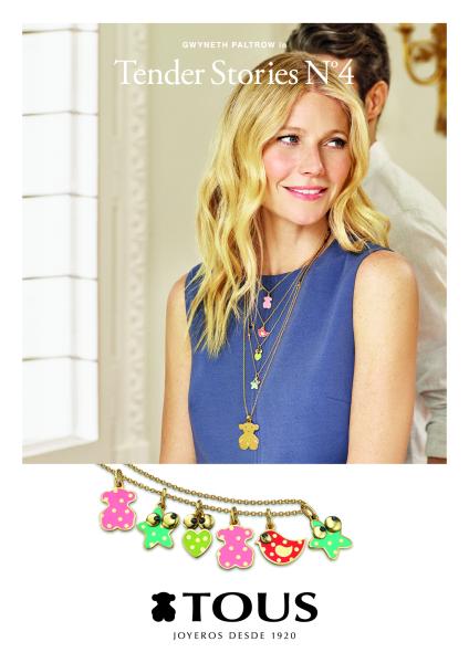La dolce, ma inossidabile Paltrow però ha sempre superato tutto, e con il massimo fair play, tanto da divenire un idolo per divorziati e coppie di separandi. Nessuna lite, nessun rancore, nessuna guerra tra ex a colpi di avvocati, «Io e Chris siamo come due fratelli», ha dichiarato di recente «dormiamo spesso sotto lo stesso tetto per il bene dei figli e siamo più uniti di prima». E questo con il benestare dei nuovi rispettivi compagni, l’attrice Annabelle Wallis per lui e il produttore Brad Falchuk per lei, proponendosi così come un nuovo meraviglioso modello di famiglia separata e felice da imitare. Quest’anno la Paltrow è il volto della nota casa di gioielli Tous, e interpreta la protagonista di Tender Stories Nº4, una fashion clip nella quale l’attrice veste i panni di Alice, una donna che vive sentendo il calore e l’amore del proprio partner nonostante la distanza che li separa.