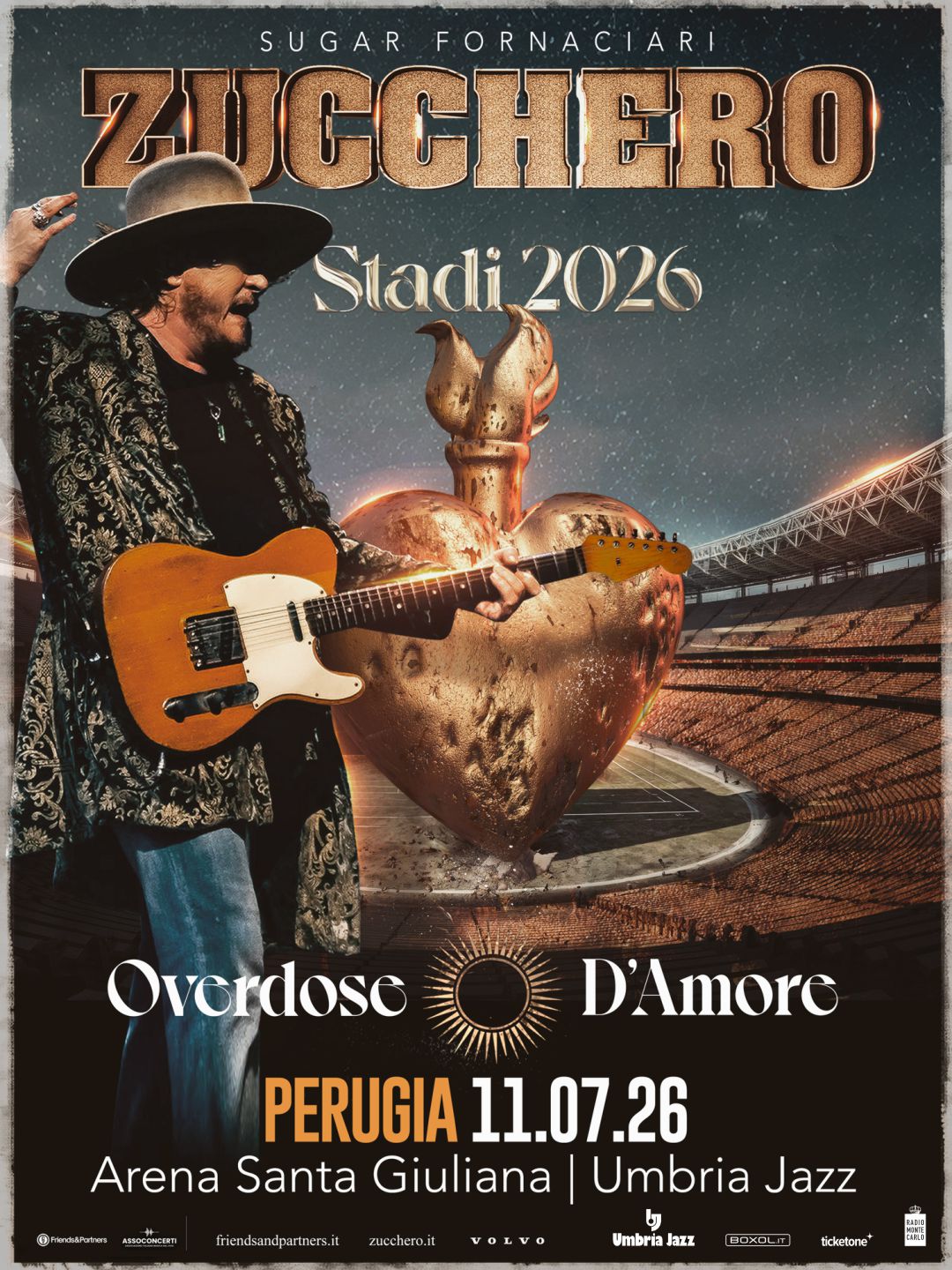 Appuntamento a Perugia, all'Arena Santa Giuliana, l'11 luglio 2026: Zucchero sarà ospite di Umbria Jazz con la sua voce inconfondibile e unica e il suo repertorio ricco di brani che emozionano. Con l'artista, la sua band straordinaria da sempre composta da grandissimi professionisti internazionali.