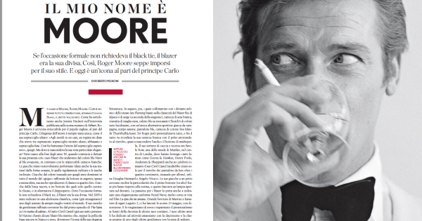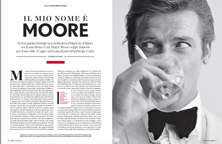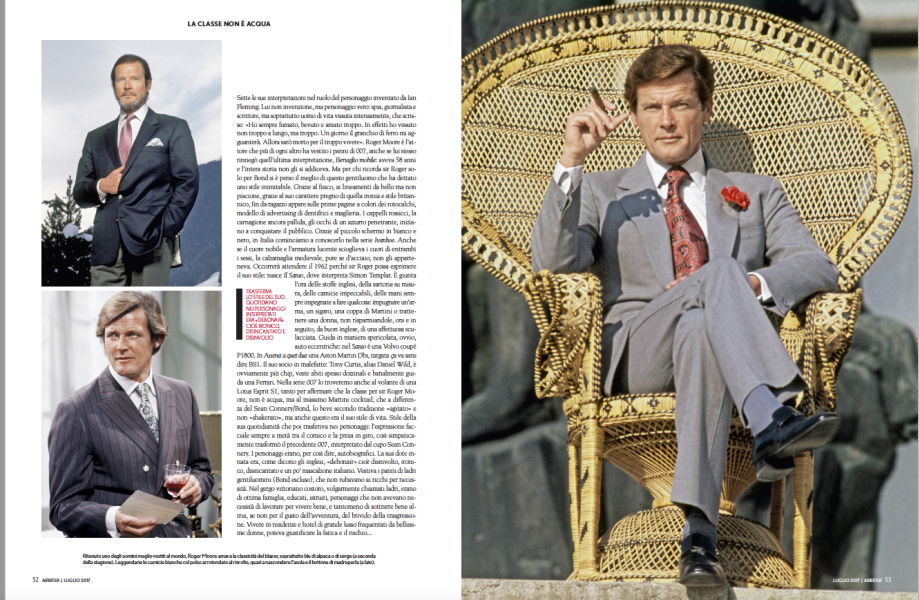 Sir Roger però personalizzava tutto, e fra il tutto va ricordata la sua camicia bianca con il polso arrotondato al risvolto, quasi a nascondere l’asola e il bottone di madreperla. Il suo terreno di caccia e ricerca era Savile Row, una delle strade di Mayfair, nel centro di Londra, dove hanno bottega i sarti famosi come Gieves & Hawkes, Henry Poole, Anderson & Sheppard; anche se i preferiti rimasero il suo Cyril Castel (andrebbe citato solo per il risvolto dei pantaloni da ben oltre i quattro centimetri, inusuale per allora), infine Douglas Hayward e Angelo Vitucci. Le sue giacche a un petto avevano inoltre la particolarità che il primo bottone (in alto) fosse più basso rispetto alla norma, e questo lasciava un’ampia apertura sul davanti. La passione per i blazer lo porta anche a indossare una elegantissima uniforme Royal Navy, molto corta in vita nel film La spia che mi amava. Grande bevitore di Martini e fumatore di sigari Laguito 2, ci ha lasciati lo scorso 23 maggio, con discrezione. E lo ringraziamo di averci risparmiato il presenzialismo ai limiti della decenza di alcuni suoi coetanei. I suoi ultimi anni li ha dedicati ad attività umanitarie con la discrezione e la classe proprie di uno degli ultimi gentlemen con licenza di sedurre.