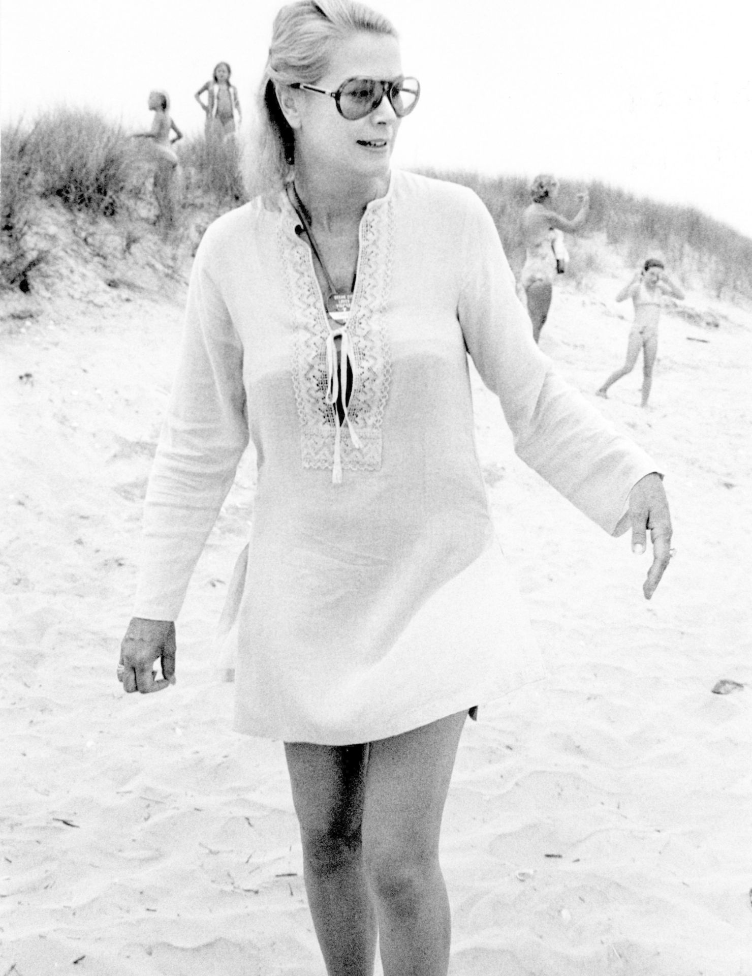 Grace Kelly ha coperto il costume con un semplicissimo caftano chiaro, con laccetti colorati. Indossa occhiali da sole dalla montatura lineare e ha tirato indietro le ciocche laterali dei capelli.