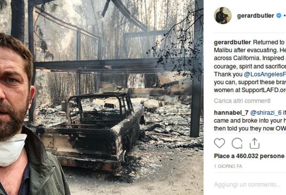 Gerard Butler ha postato online una foto dove afferma la sua casa è “mezza bruciata” e ha ringraziato i vigili del fuoco per l’incredibile lavoro che stanno svolgendo.
