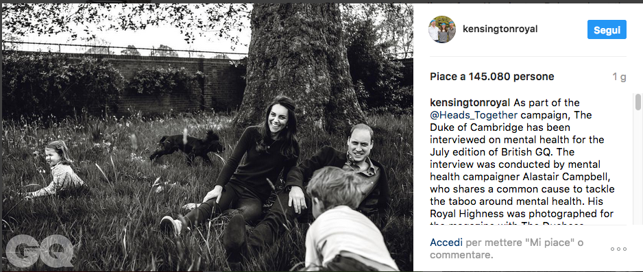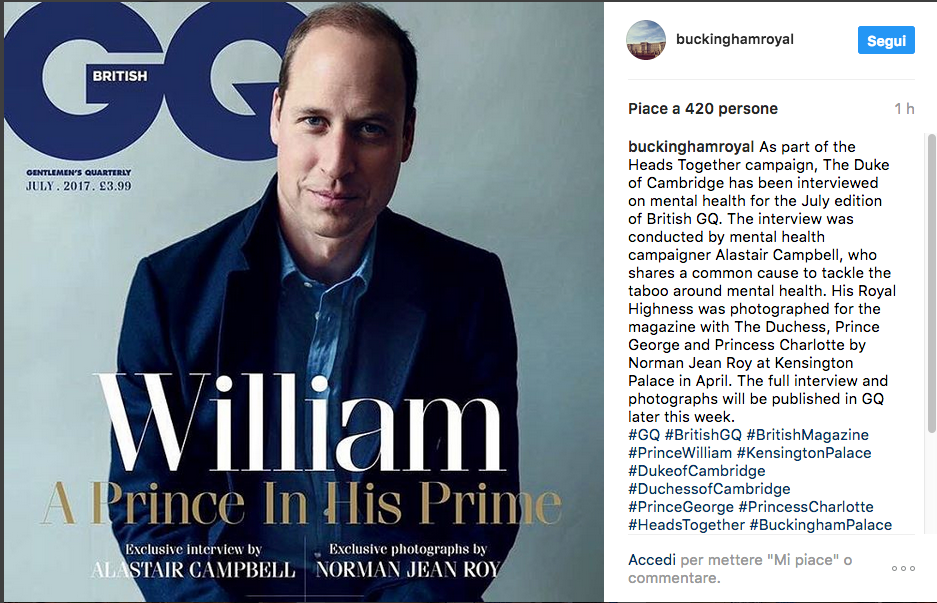 Il Principe William ha concesso l’intervista per rendere noto il suo impegno nella campagna Heads Together, per combattere i pregiudizi verso chi soffre di disturbi mentali. Nella campagna sono impegnati anche la Duchessa di Cambridge e il Principe Harry.
